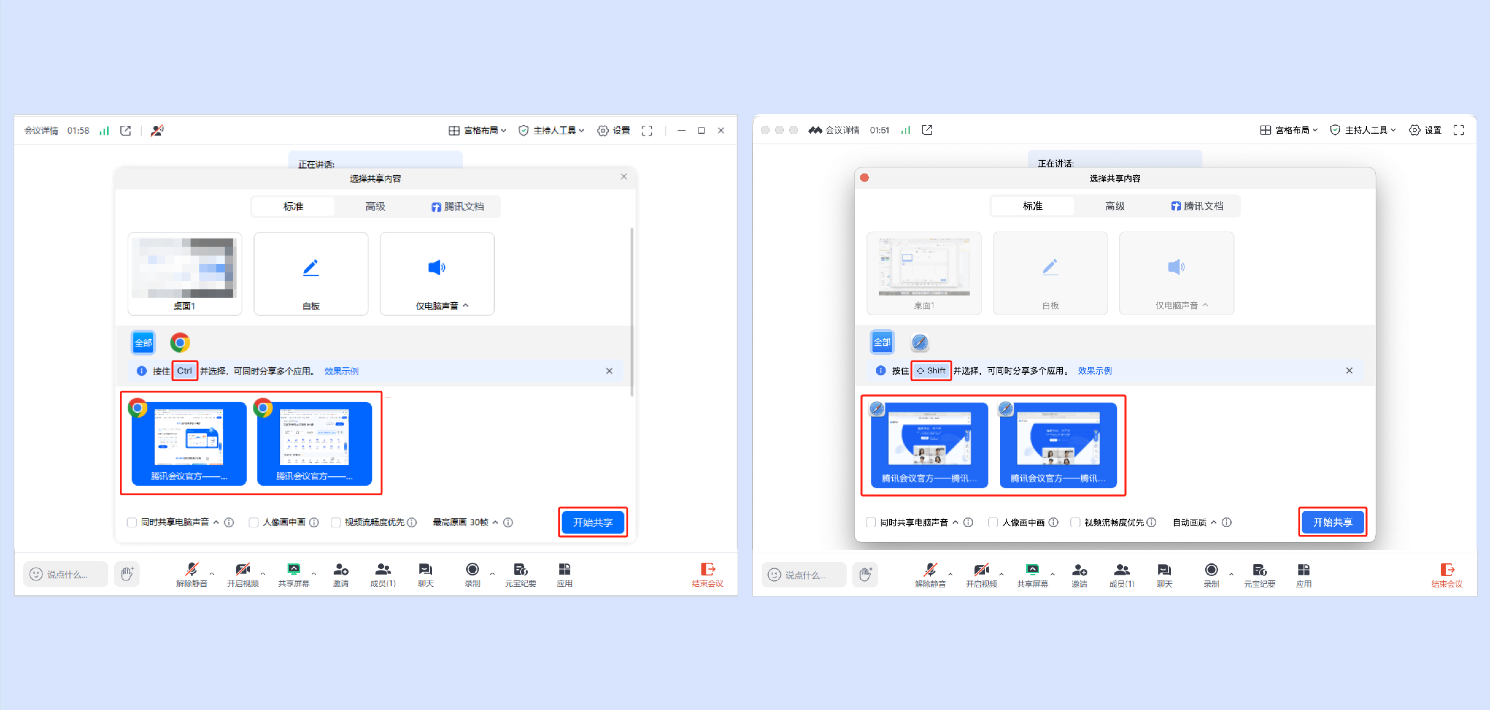 3.30及以上版本支持同时选择多个应用窗口进行共享。