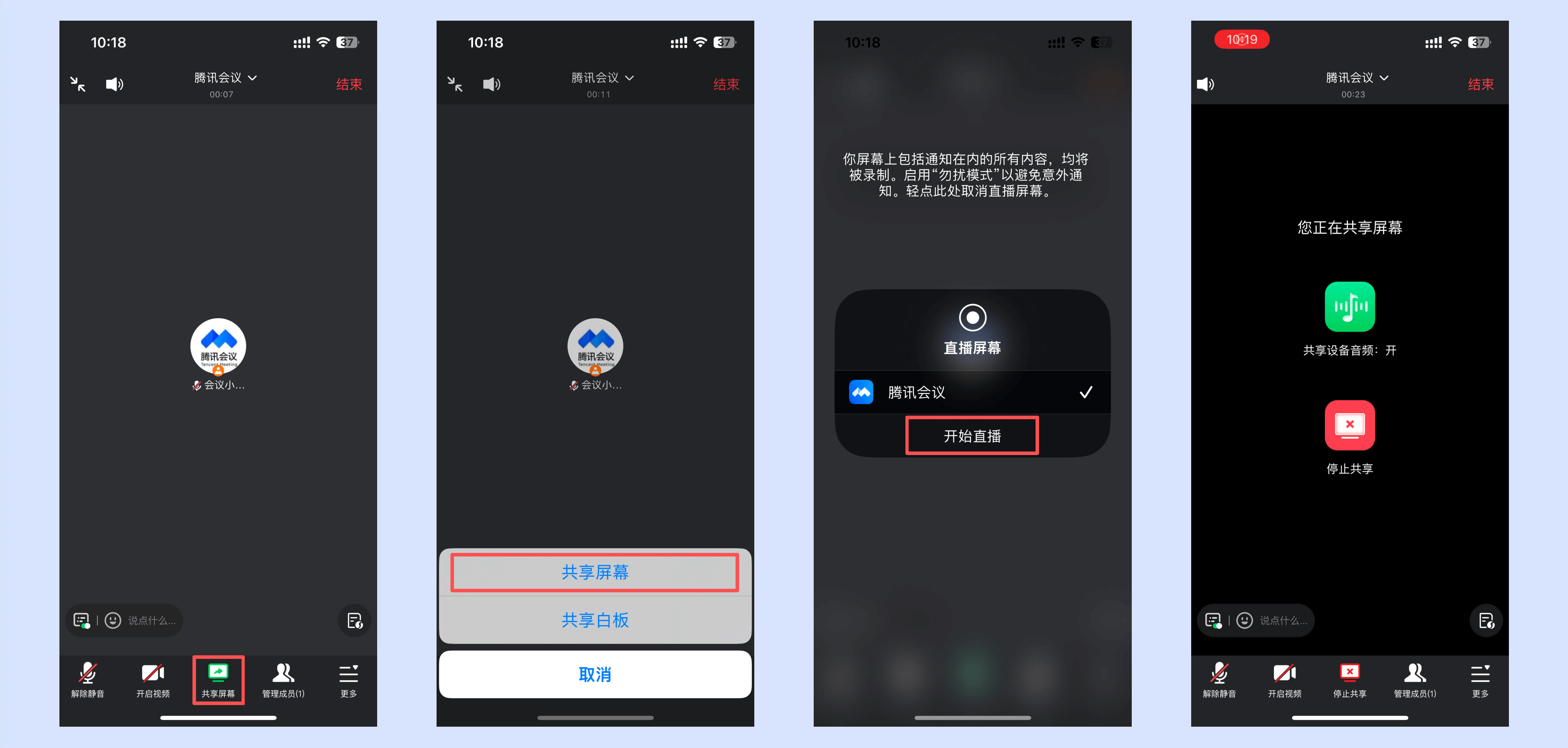 ①会中点击底部工具栏【共享屏幕】->选择【共享屏幕】->点击【开始直播】即可进入共享屏幕状态。