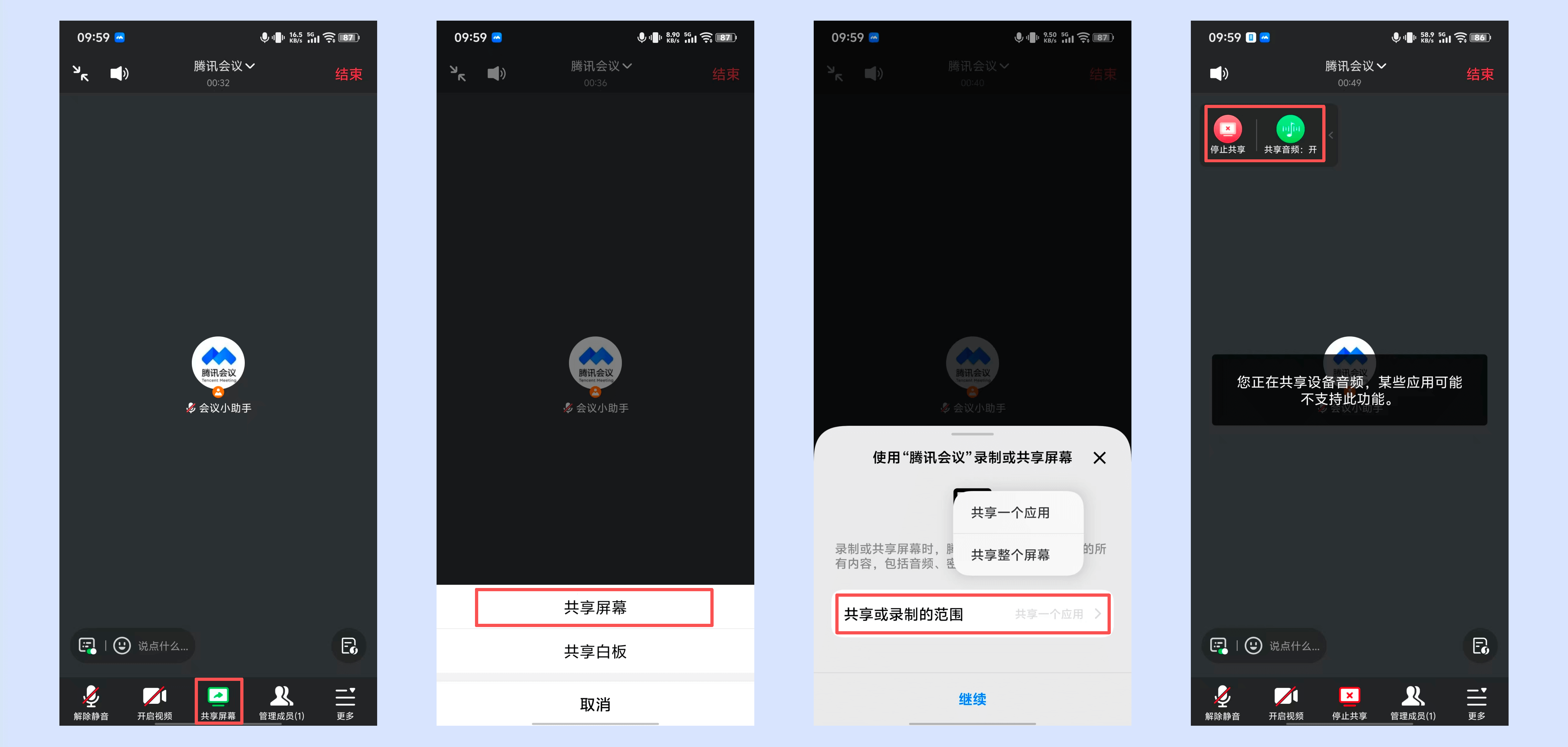 ②共享时,会将设备音频一并共享给参会者,可根据需要手动开启或关闭共享音频。