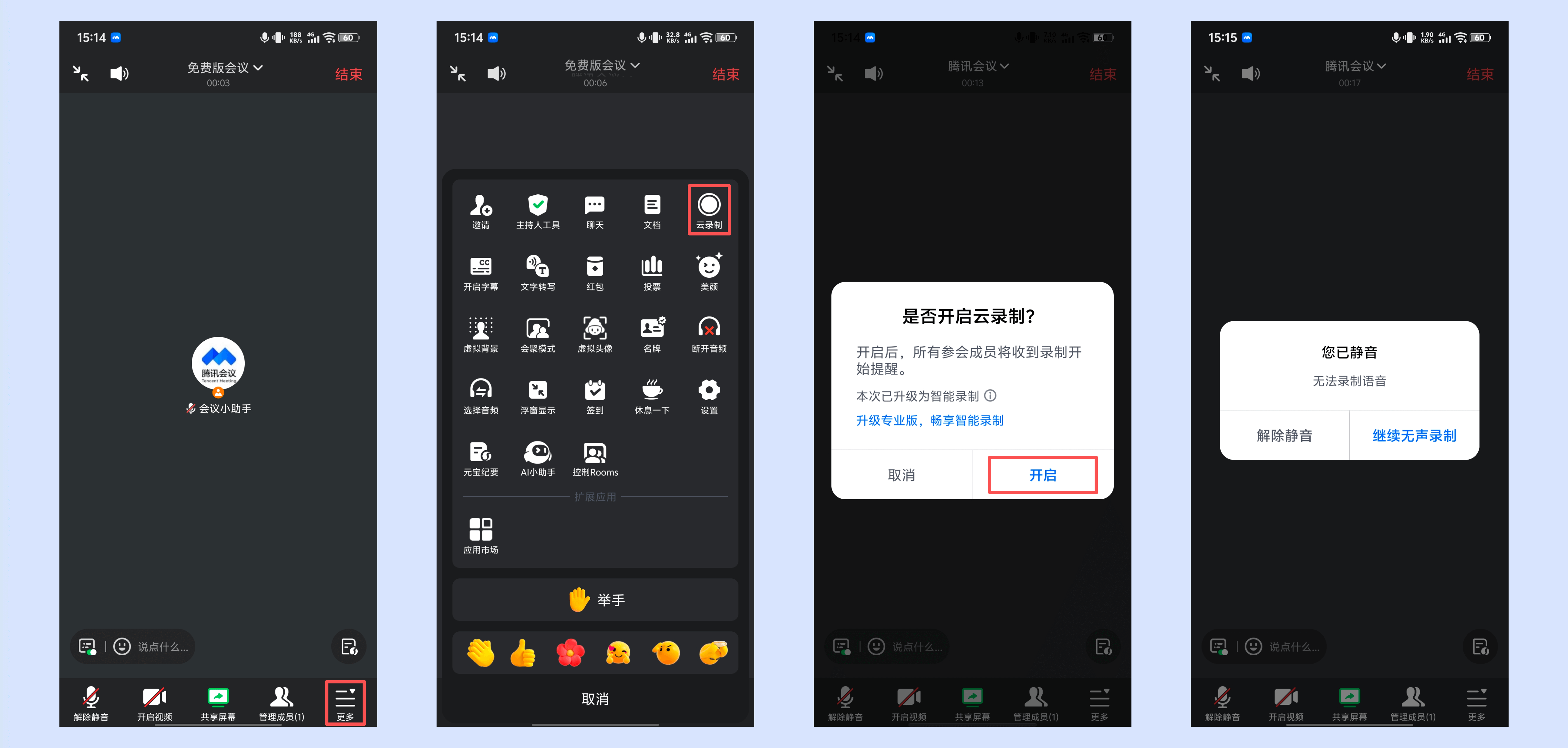①会议中,主持人/联席主持人点击工具栏中的【更多】->选择【云录制】->点击【开启】,若用户当前处于开麦状态,则正常开启录制。