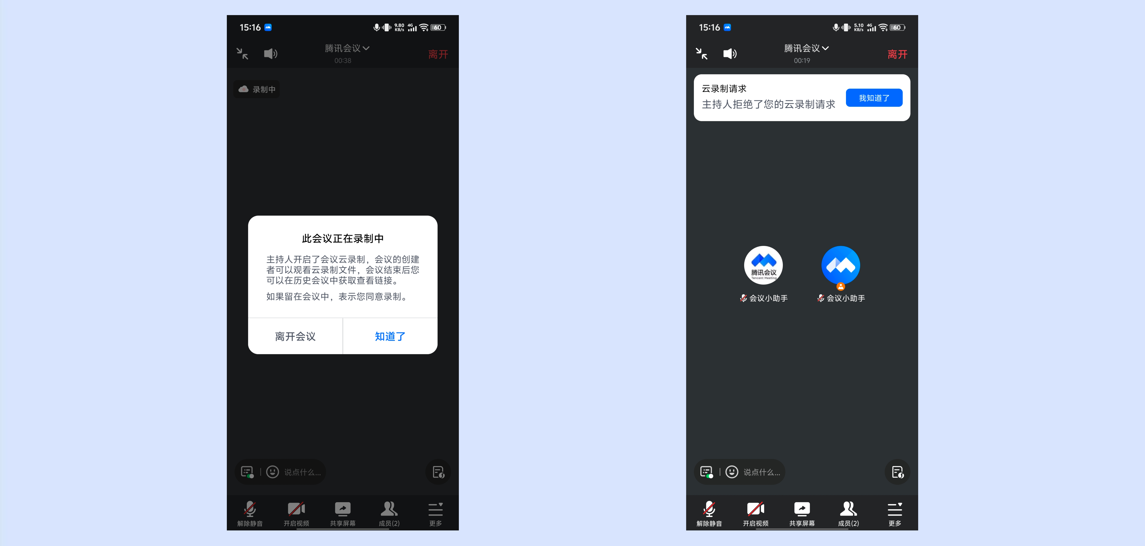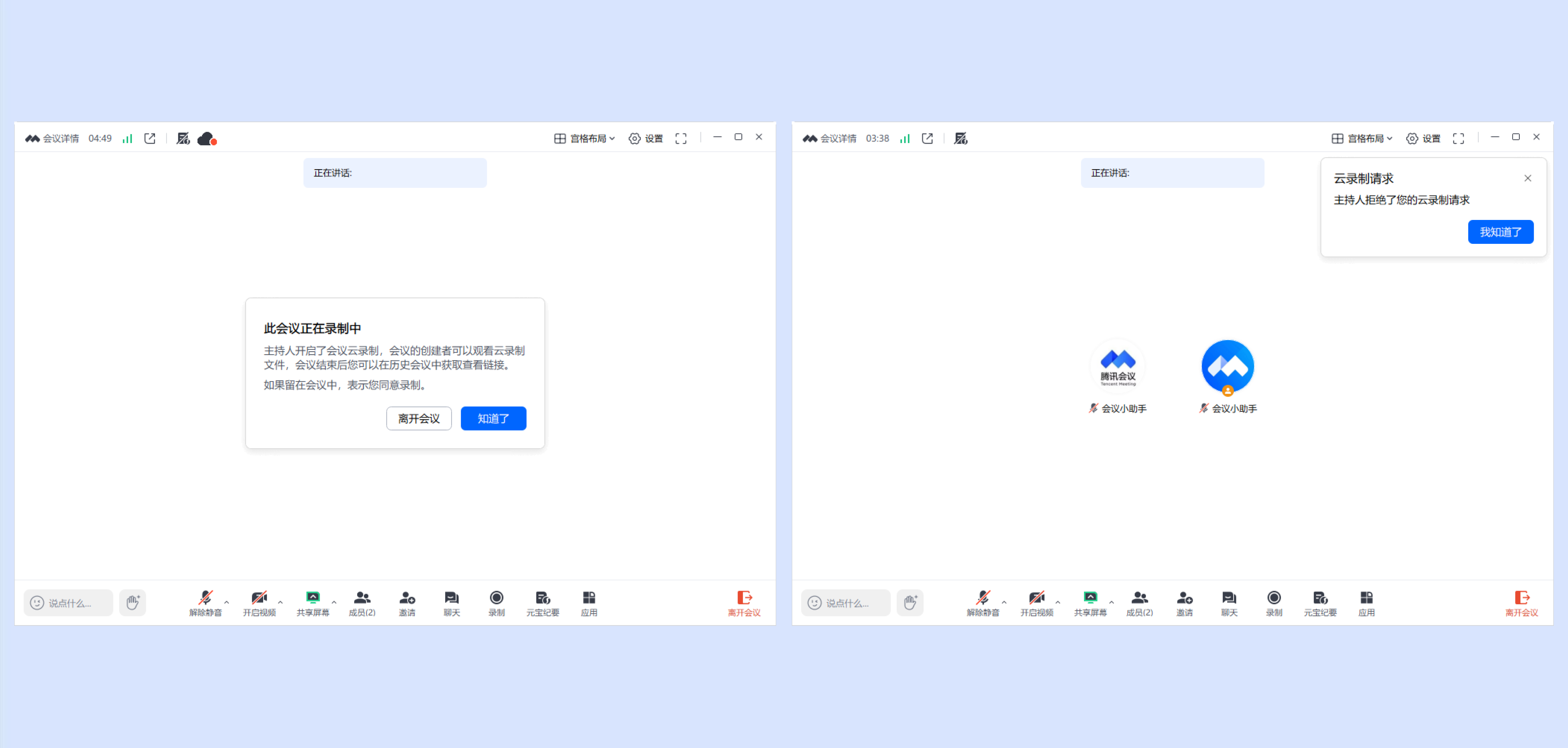 ④参会成员可以申请让主持人开启云录制。开启后,云录制内容归会议预定者所有。