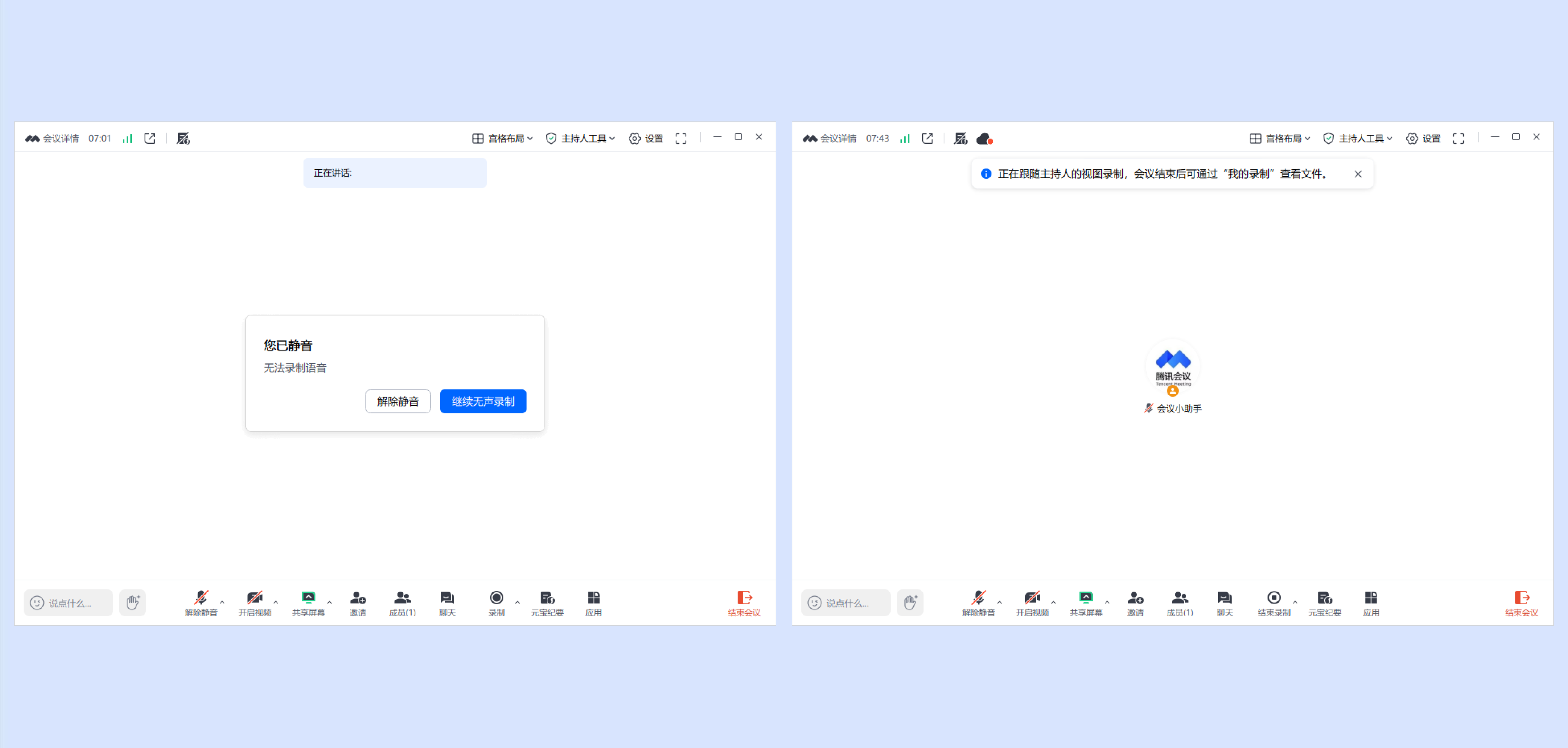 ②若用户当前处于静音状态,则提醒用户”您已静音“,可根据需要选择点击【解除静音】或【继续无声录制】,即可开启录制。