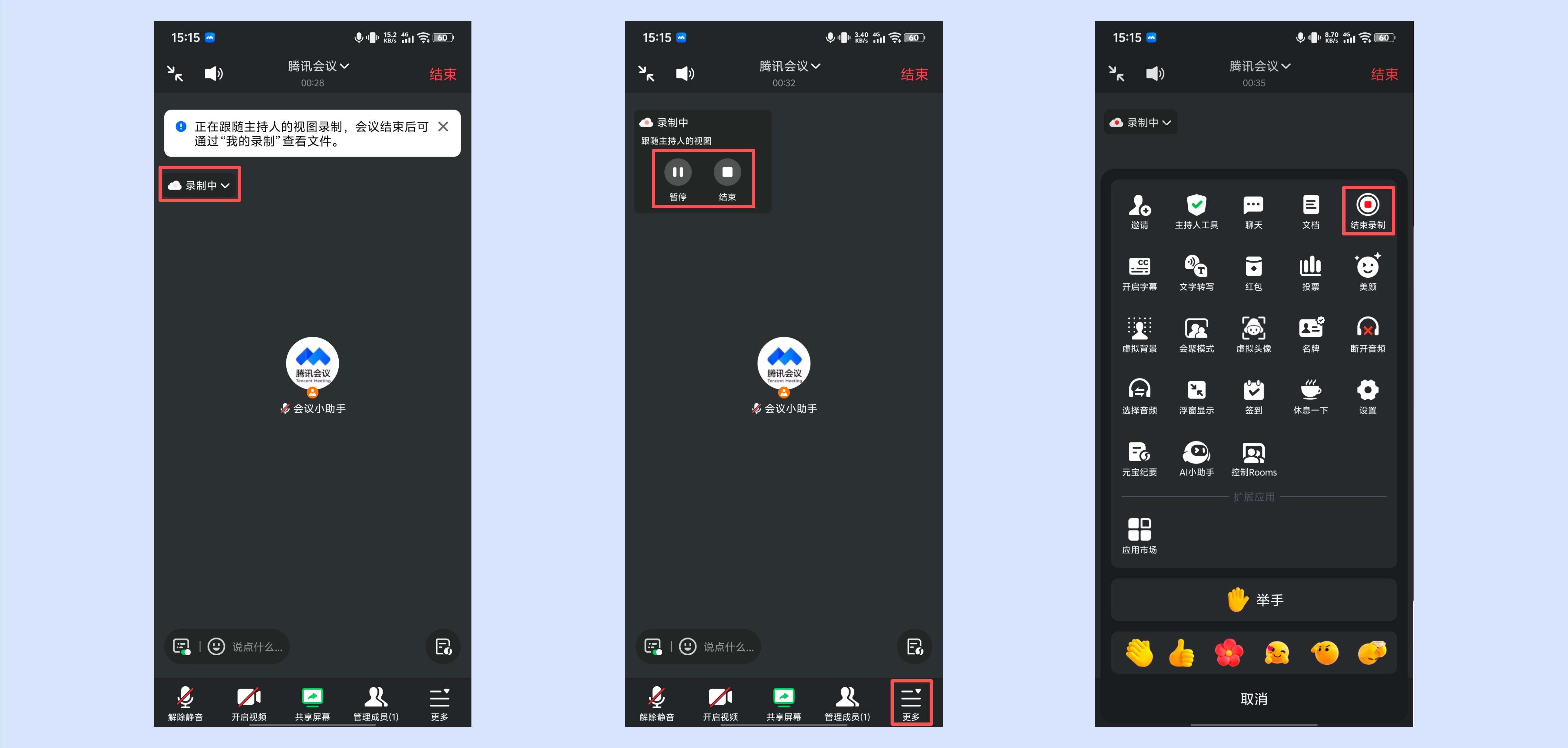 ②【更多】中的【云录制】变为【结束录制】。