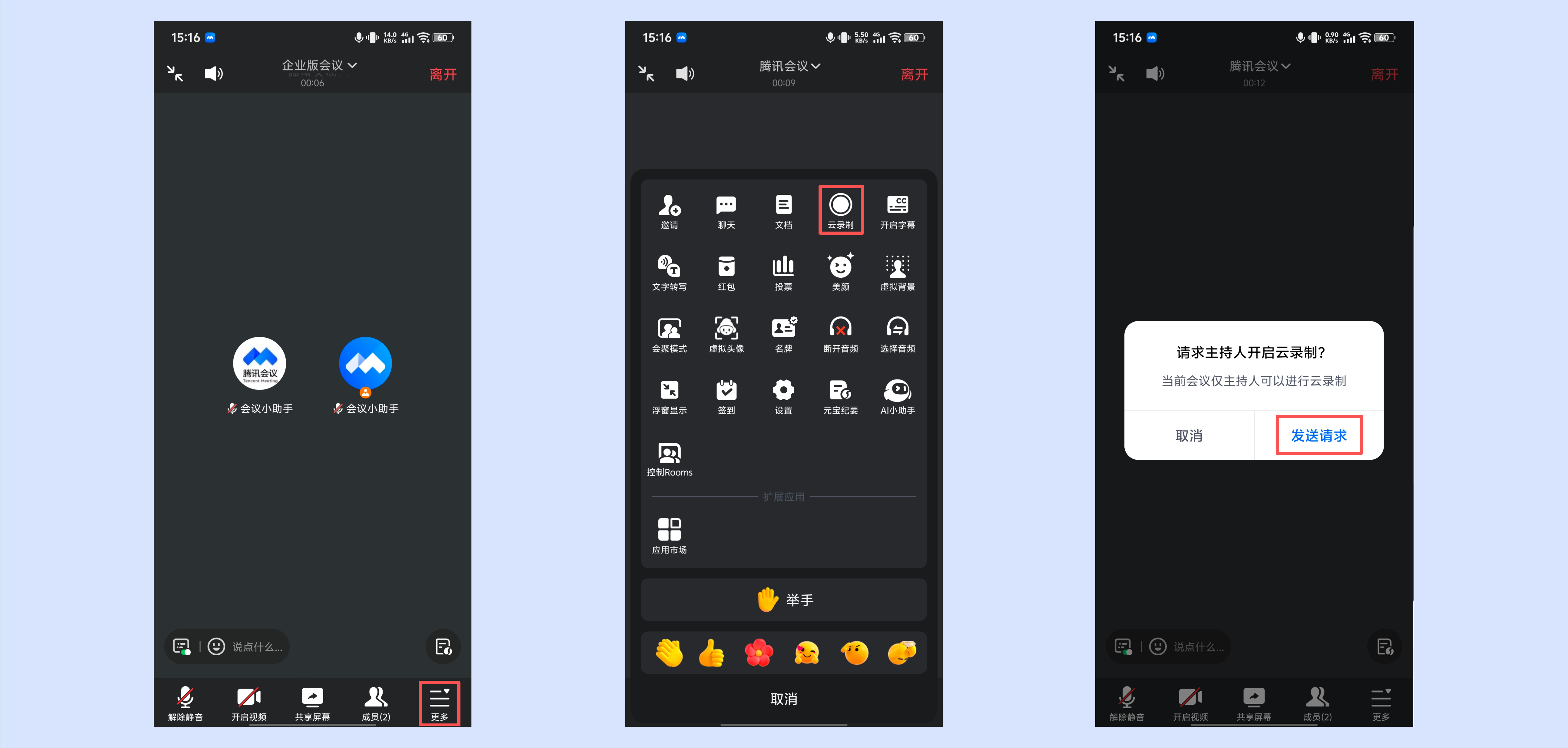 ①会中成员点击底部工具栏【更多】->【云录制】->【发送申请】即可向主持人发送开启云录制的申请。