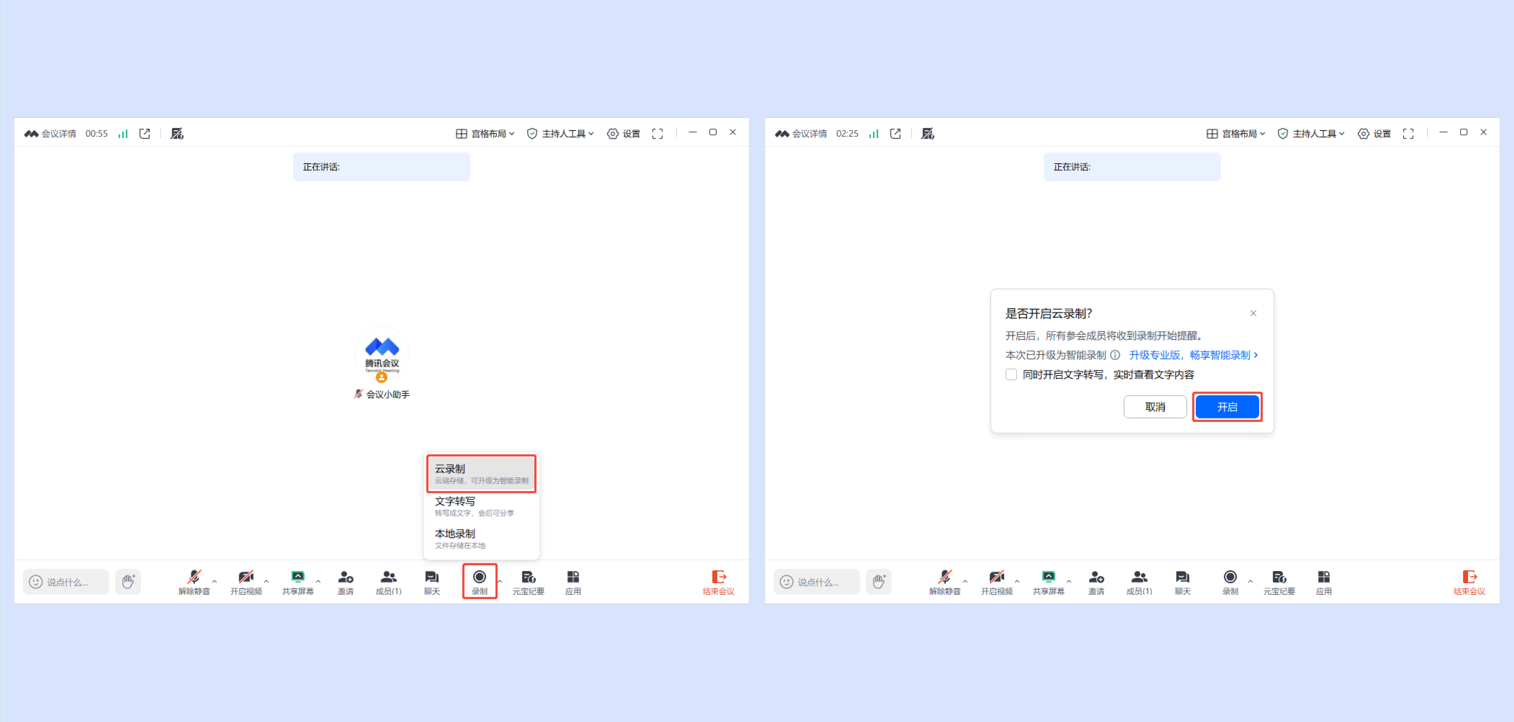 ①会议中,主持人/联席主持人点击工具栏中的【录制】->选择【云录制】->点击【开启】,若用户当前处于开麦状态,则正常开启录制。