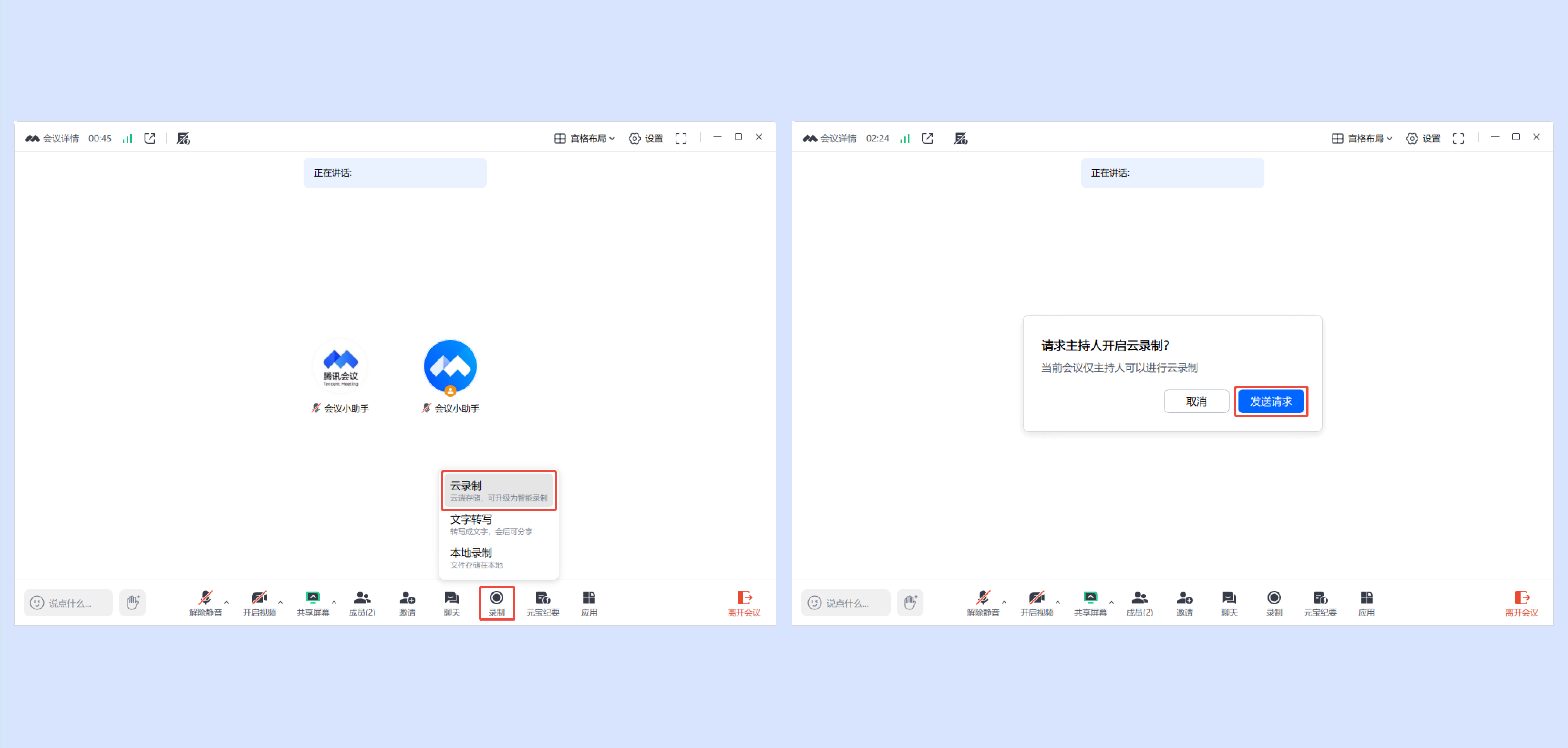 ①会中成员点击底部工具栏【录制】->【云录制】->【发送申请】即可向主持人发送开启云录制的申请。