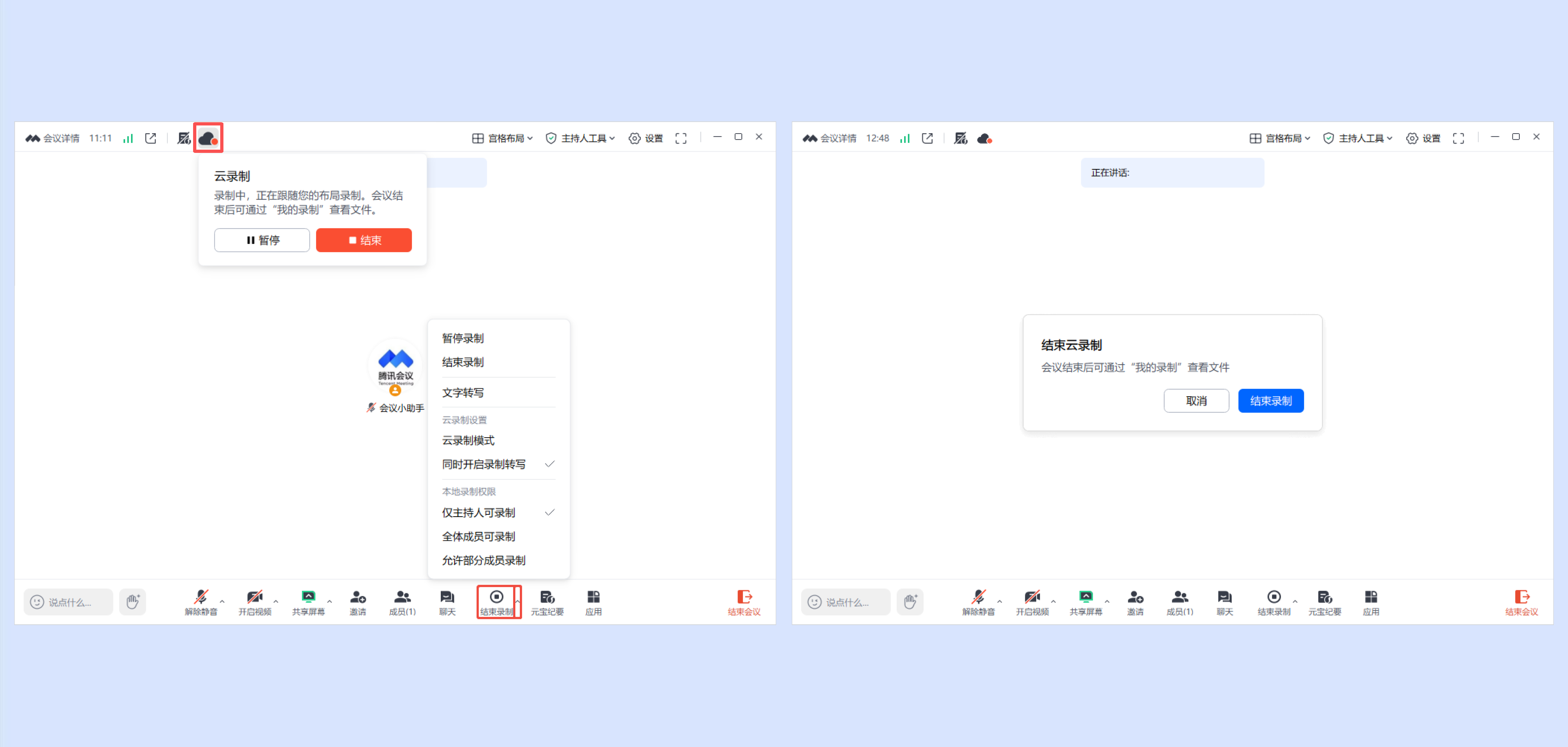 ①云录制仅主持人和联席主持人可录制,与本地录制权限无关。