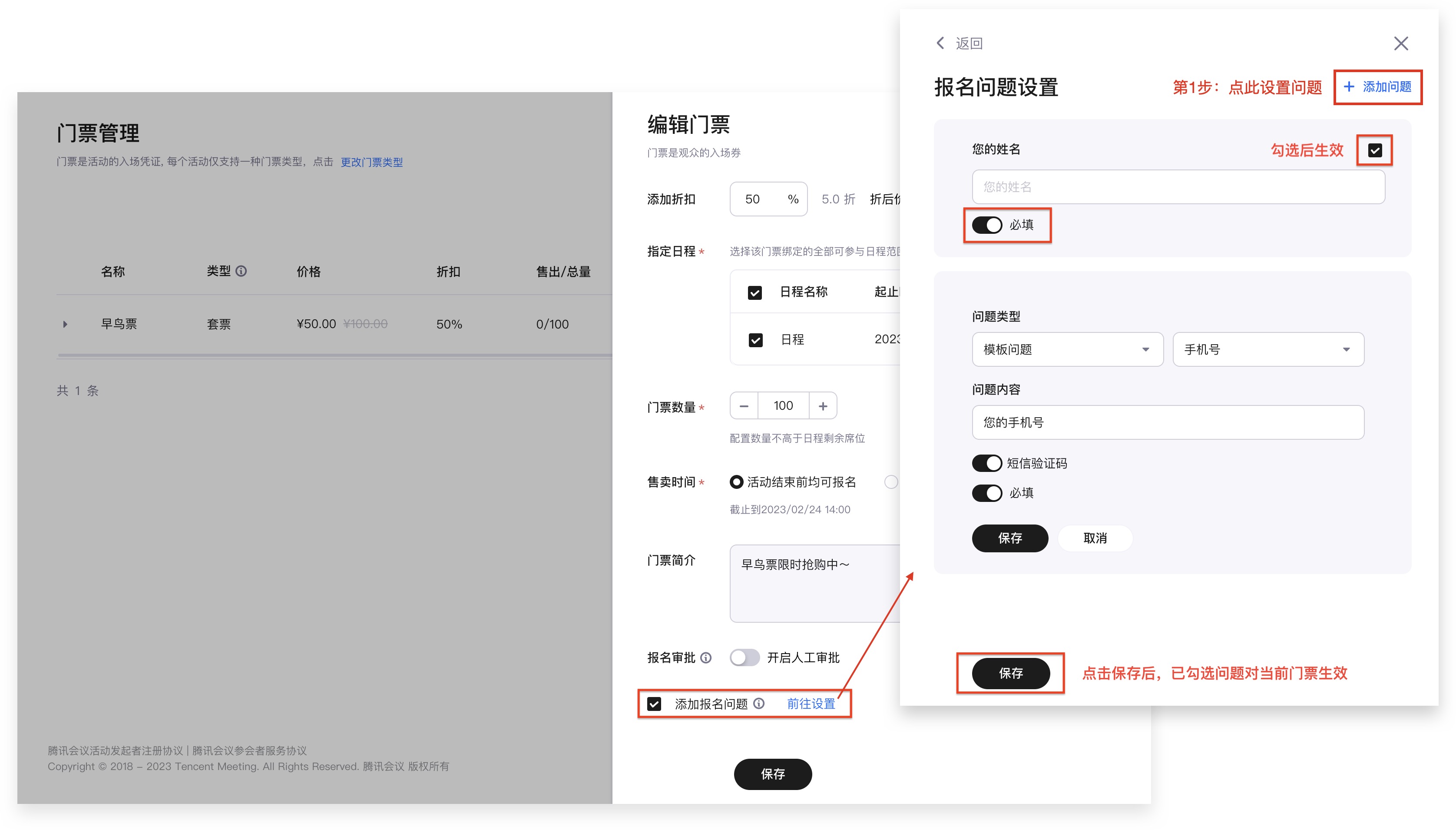 进入“门票创建” 页面->勾选【添加报名问题】->点击【前往设置】->进入报名问题编辑页。