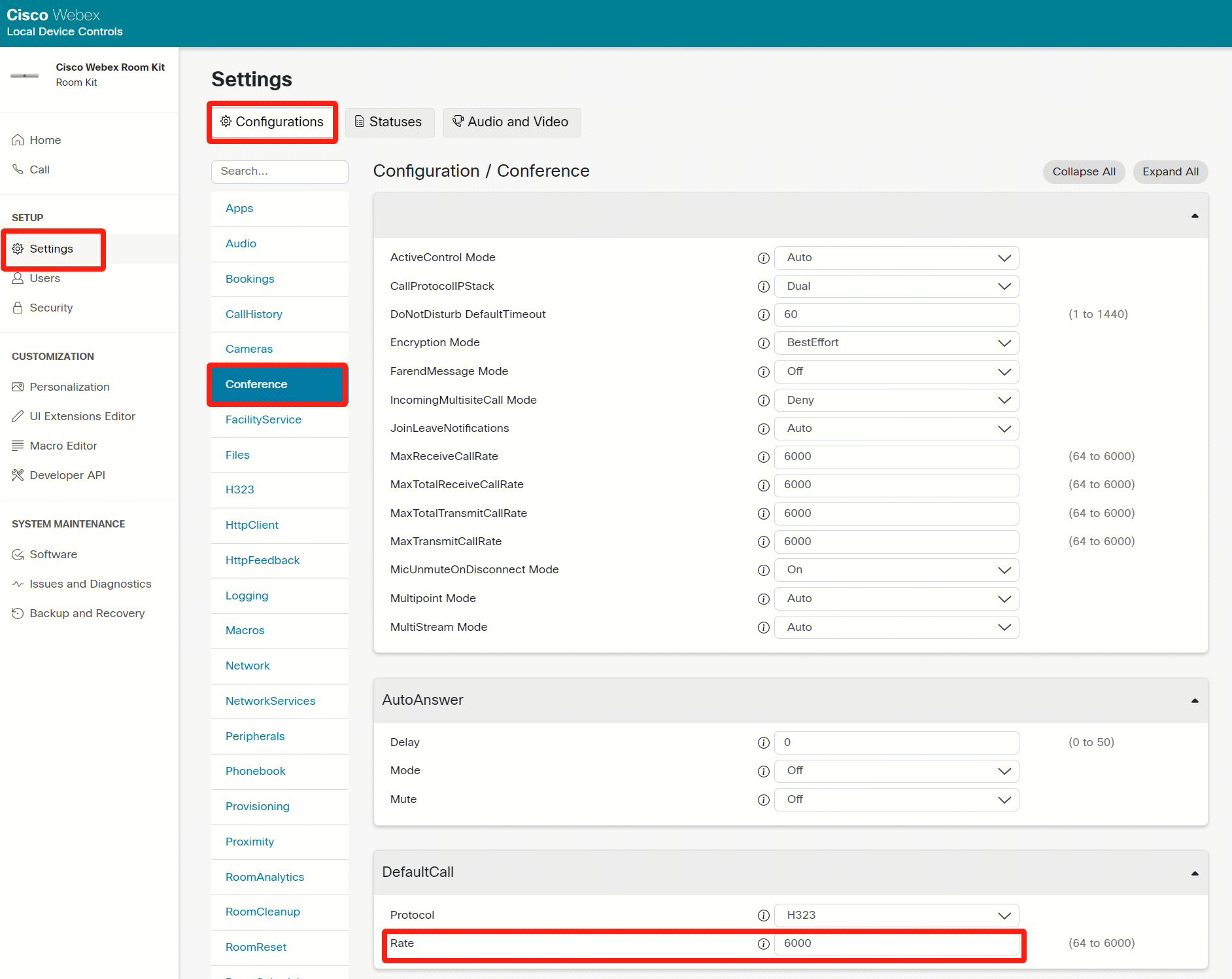 1、检查终端的默认呼叫速率设置,点击左侧目录栏的 SETUP > Settings > Configurations > DefaultCall,将 Rate 设置为 6000。