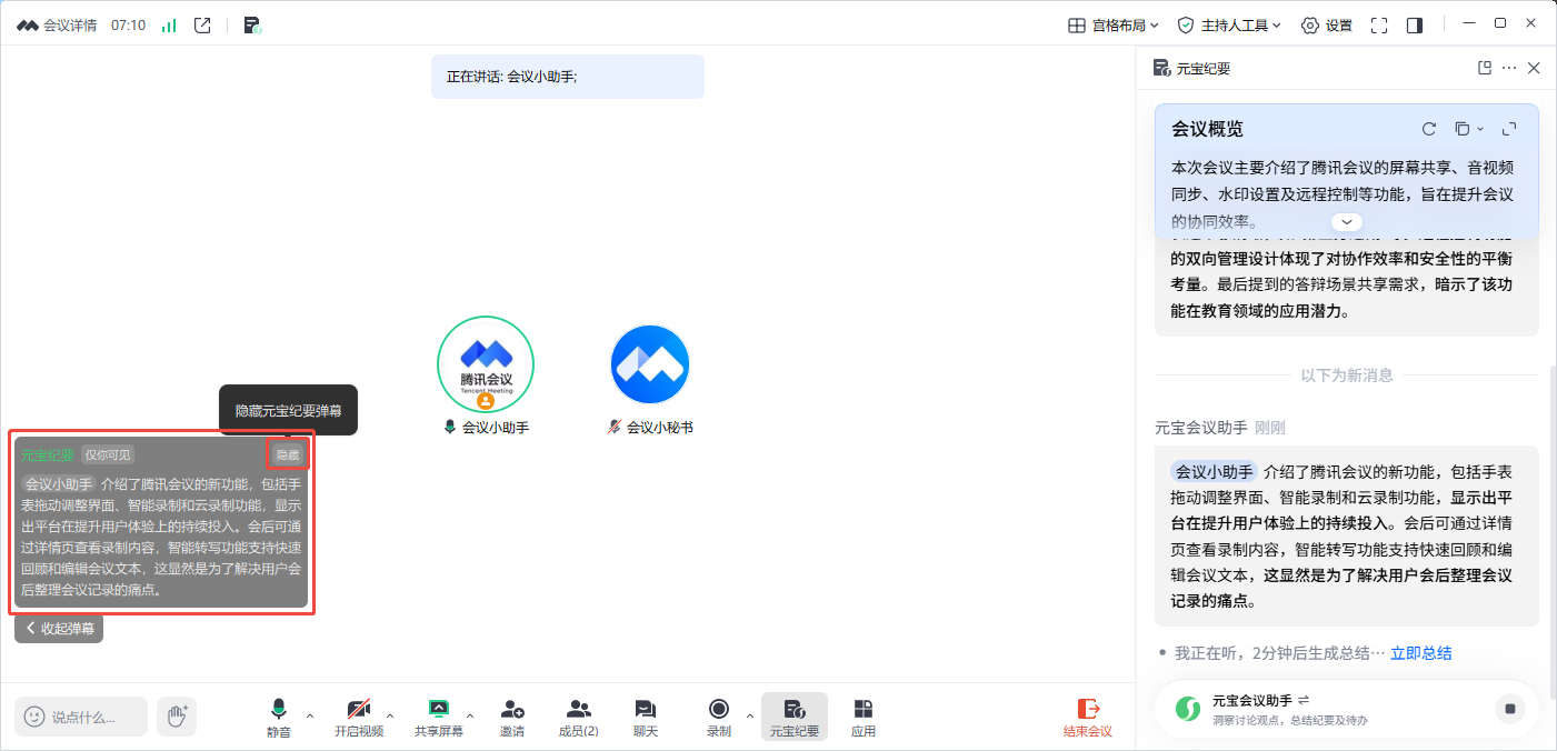⑥3.41及以上版本支持纪要内容实时显示在弹幕区,点击元宝纪要弹幕即可唤起「元宝纪要」窗口,并定位到最新一条纪要内容。点击【隐藏】即可关闭元宝纪要弹幕,不在弹幕区展示,后续可在【设置】中开启。