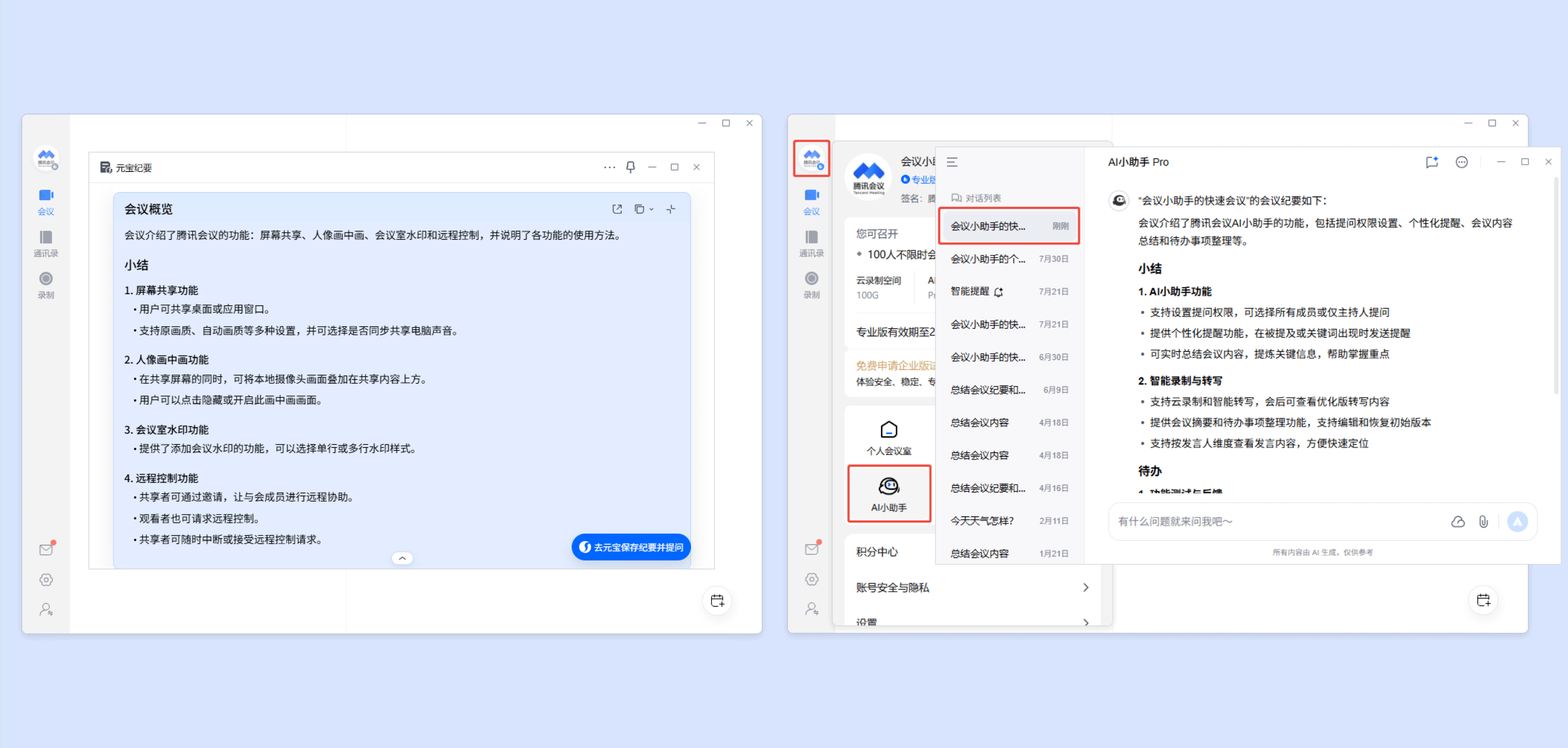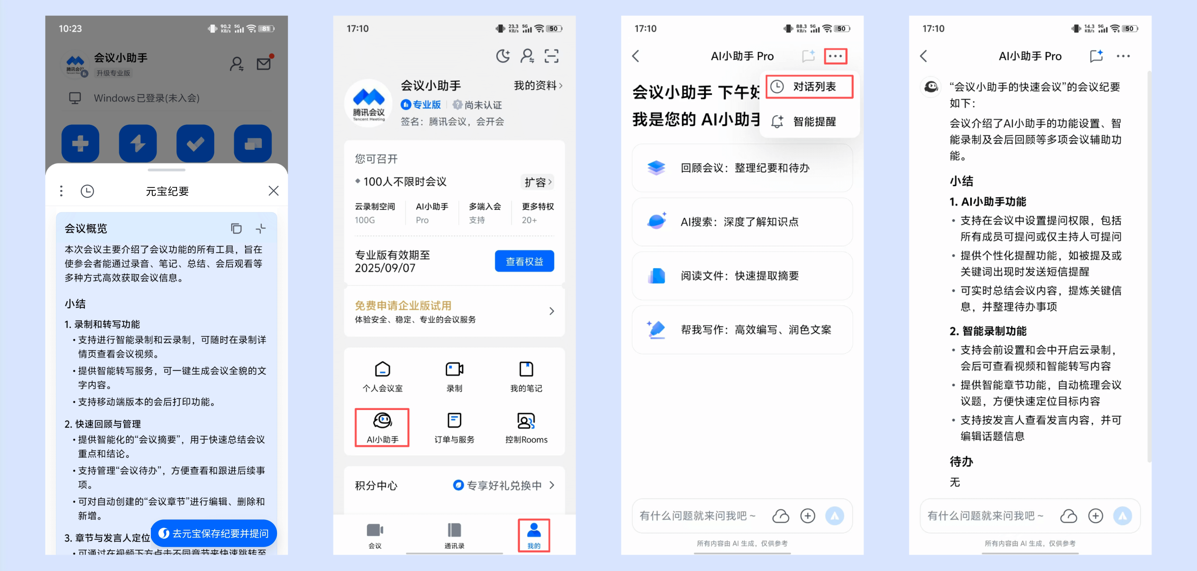 ⑥当会议结束时,会将会中的「元宝纪要」应用保留到会后,便于您快捷查看和使用。并且可以点击右下角的【去元宝保存纪要提问】,唤起元宝客户端,进行提问。还可以在「个人资料页-AI小助手-对话列表」中找到对应的会议,查看会议概览的内容。