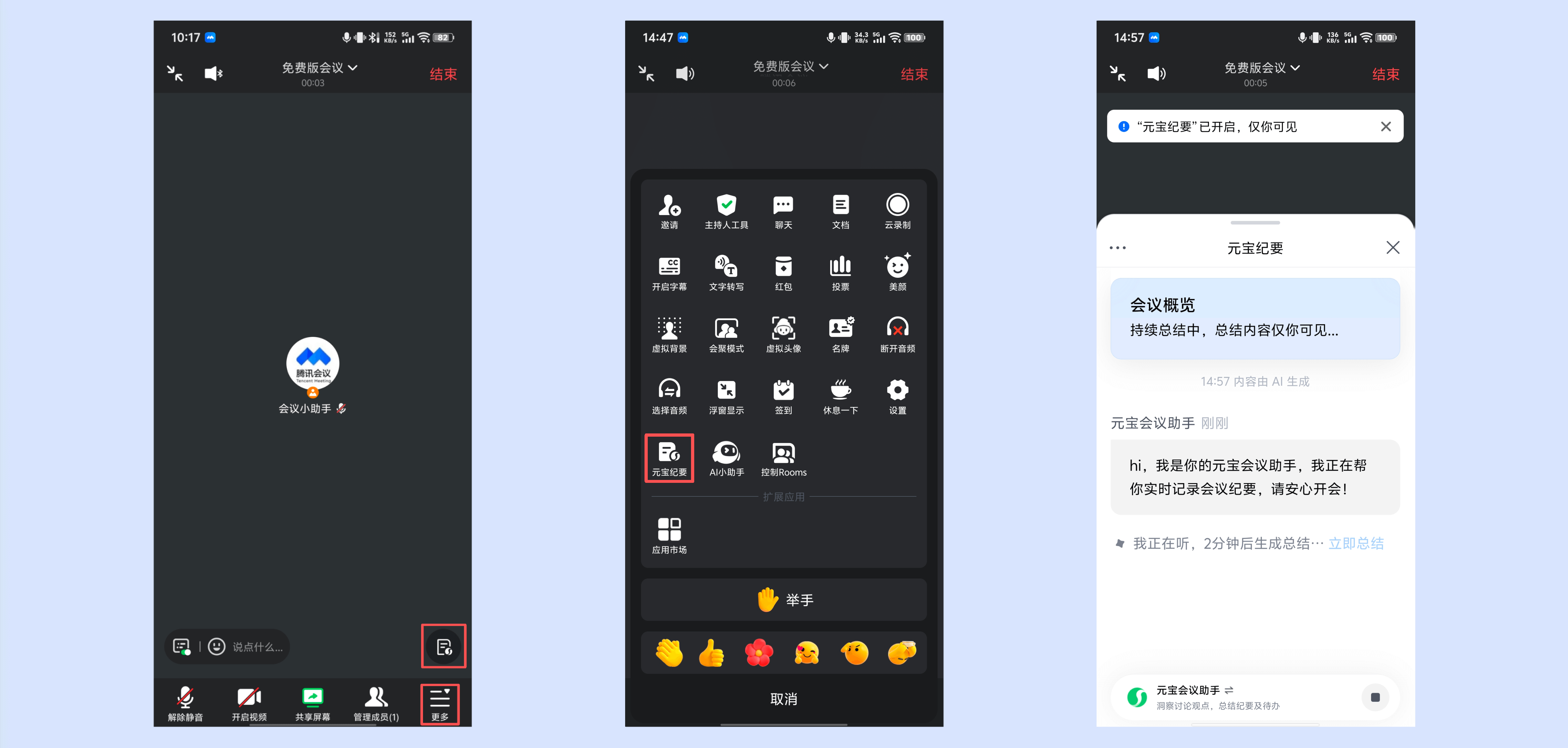 ①会中可点击屏幕右下方【元宝纪要】按钮,唤起元宝纪要窗口总结会中内容(仅自己可见)。还可以在底部工具栏【更多】中点击【元宝纪要】唤起元宝纪要窗口。