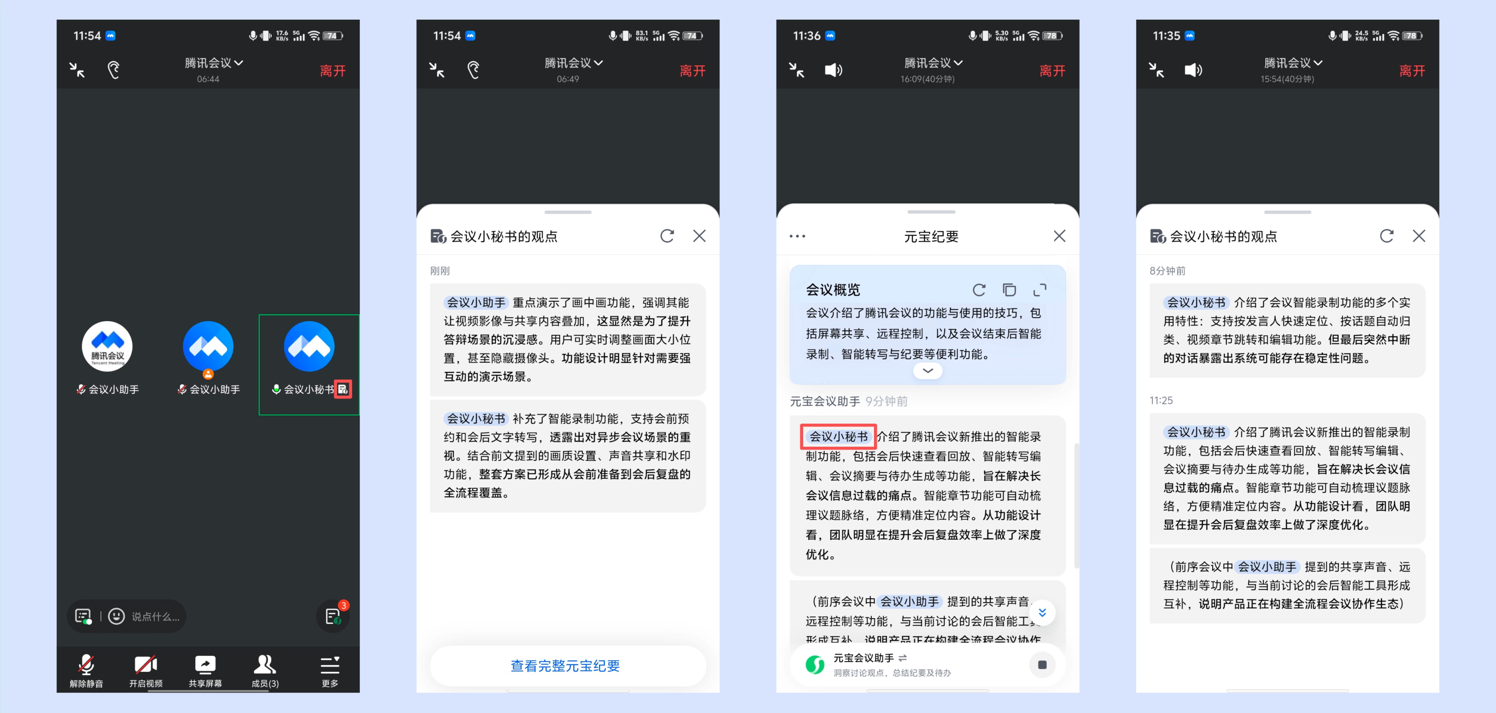 ③3.39及以上版本支持查看所选发言人的观点,可点击该成员名称旁的“元宝纪要”图标,查看其观点(可一键查看完整纪要);还可以在「元宝纪要」中点击成员名称,查看其观点。