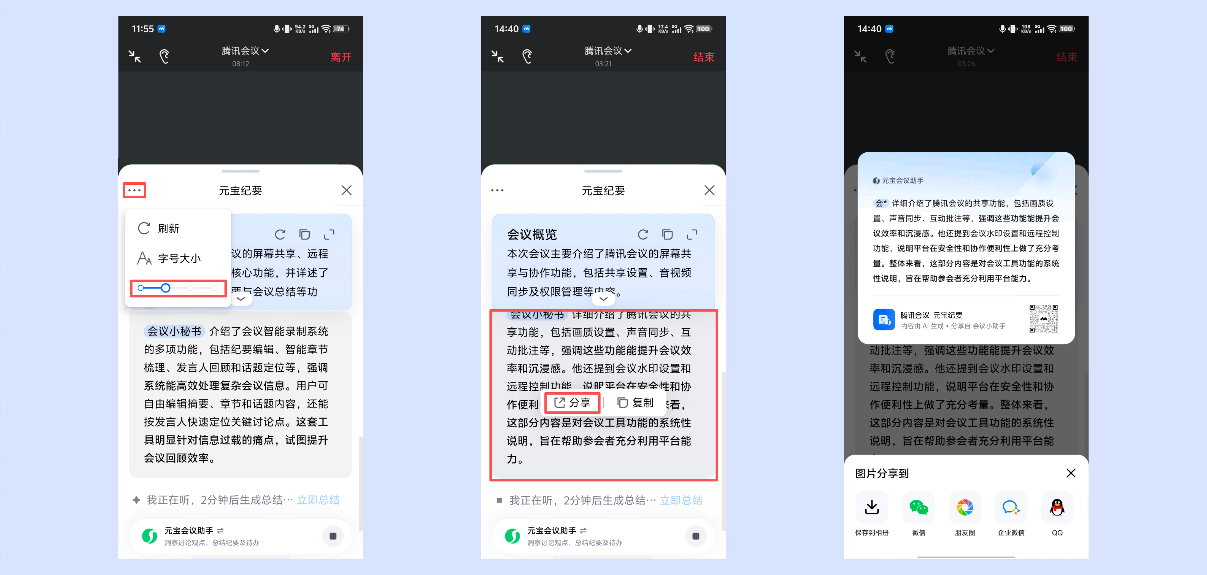 ⑤3.40及以上版本支持快捷分享纪要内容,可长按「元宝纪要」中需要分享的单条内容并点击分享按钮,即可生成「元宝纪要」图片进行分享。