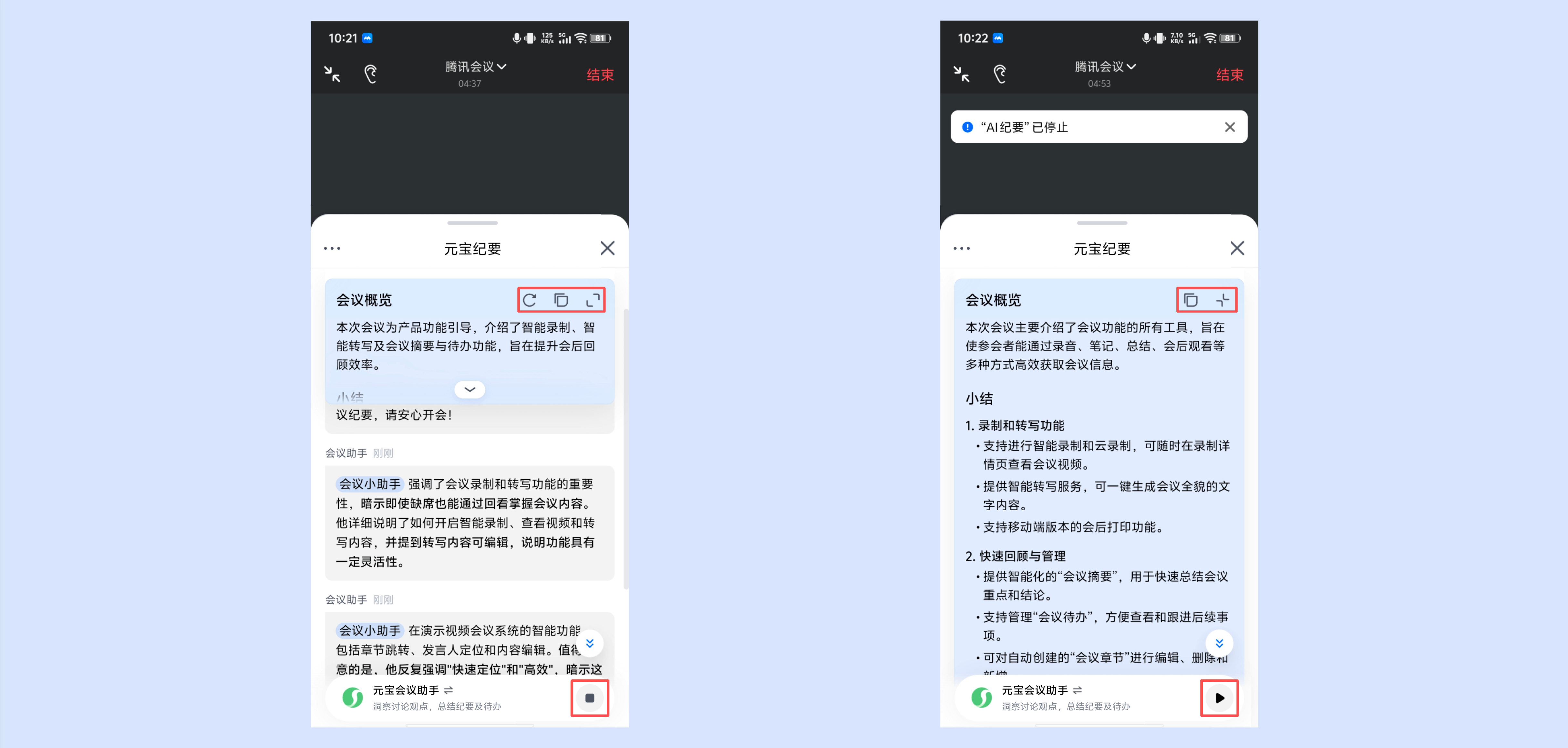 ②点击“暂停”按钮,将停止对会议内容进行总结;点击“继续”按钮,即可恢复对后续会议内容的总结。