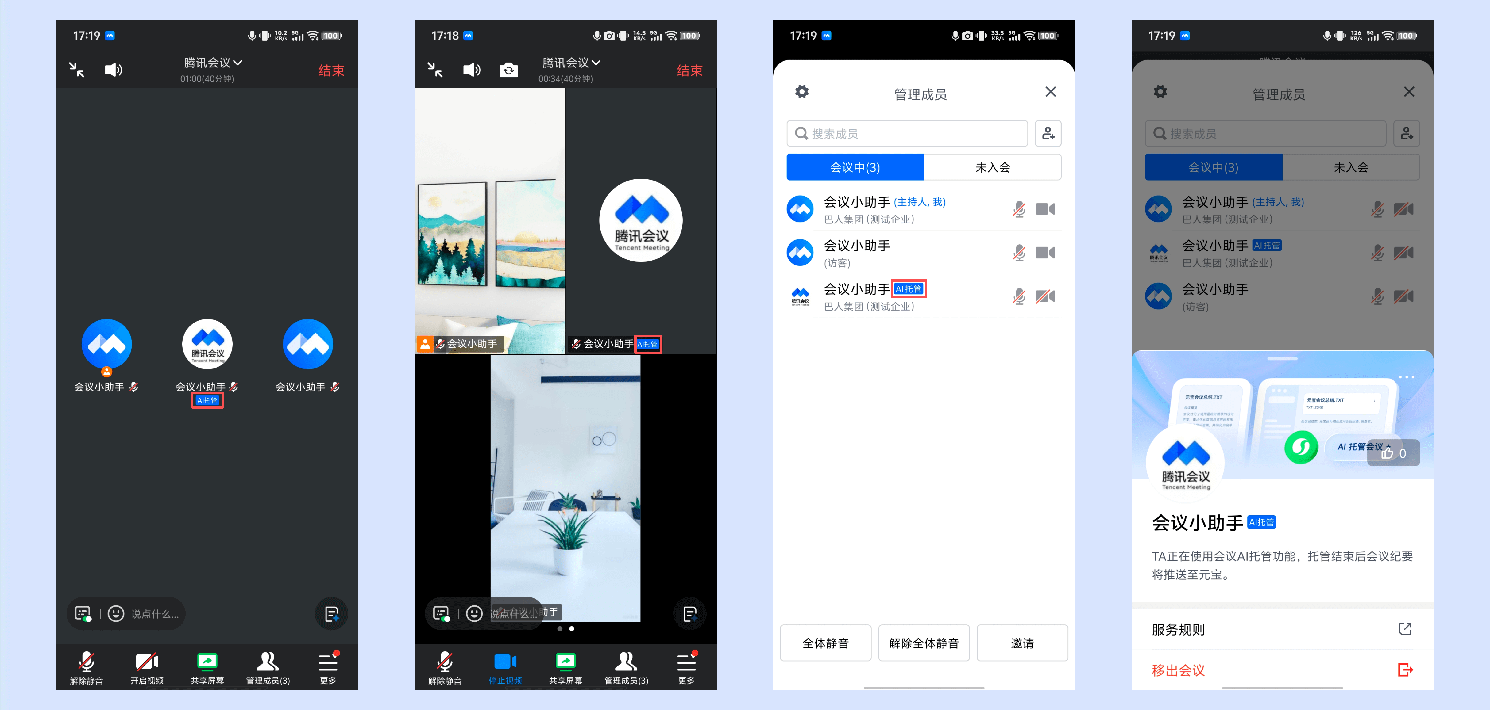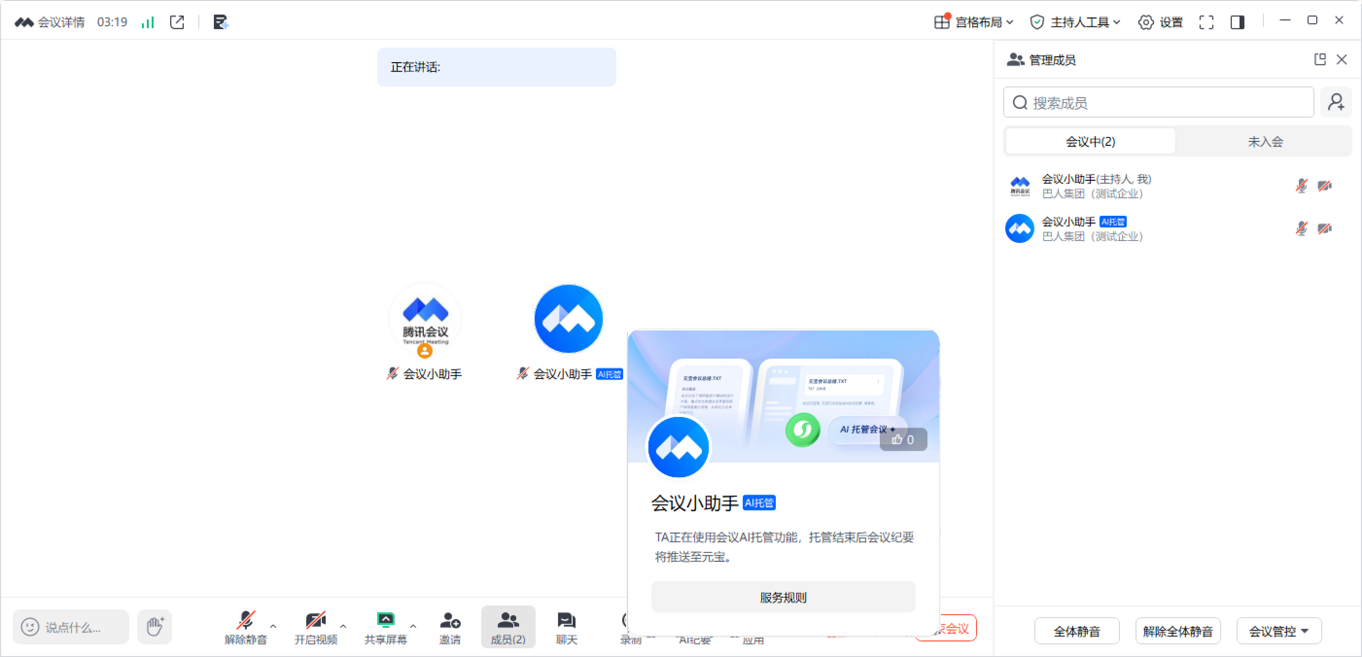 ④当会中有成员使用腾讯元宝AI托管会议时,将会在该成员昵称旁显示AI托管标识。