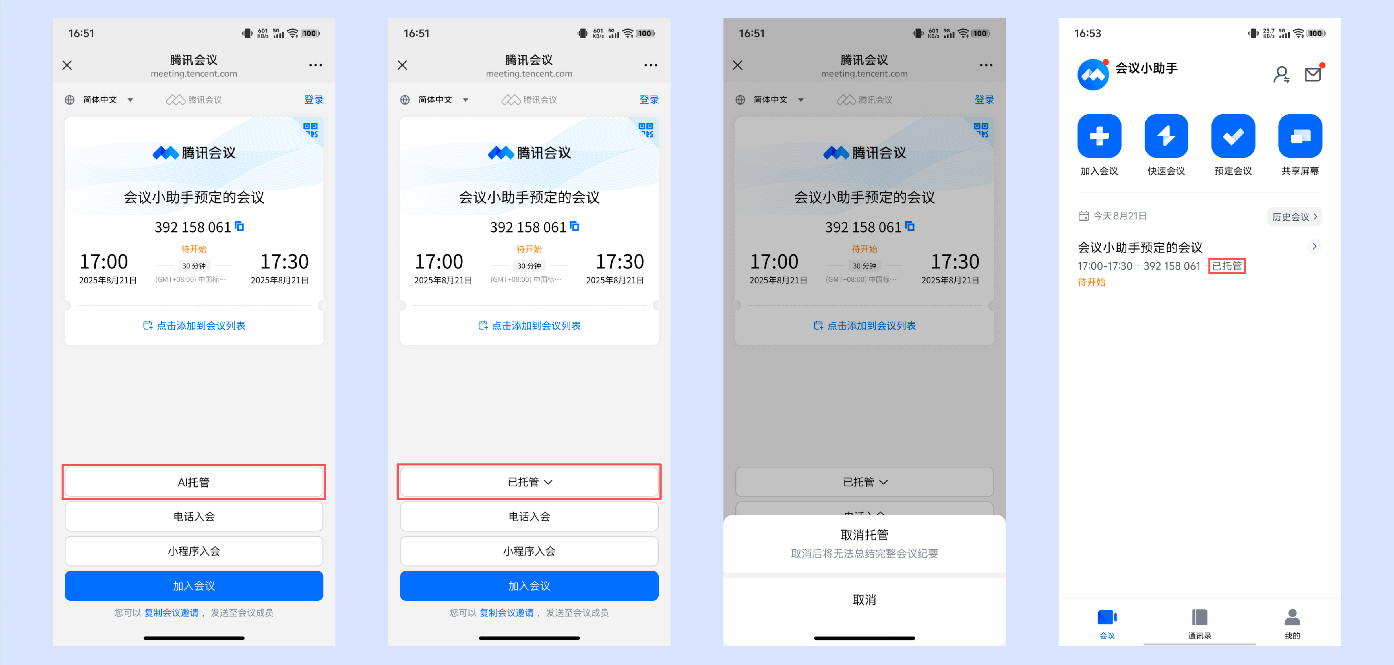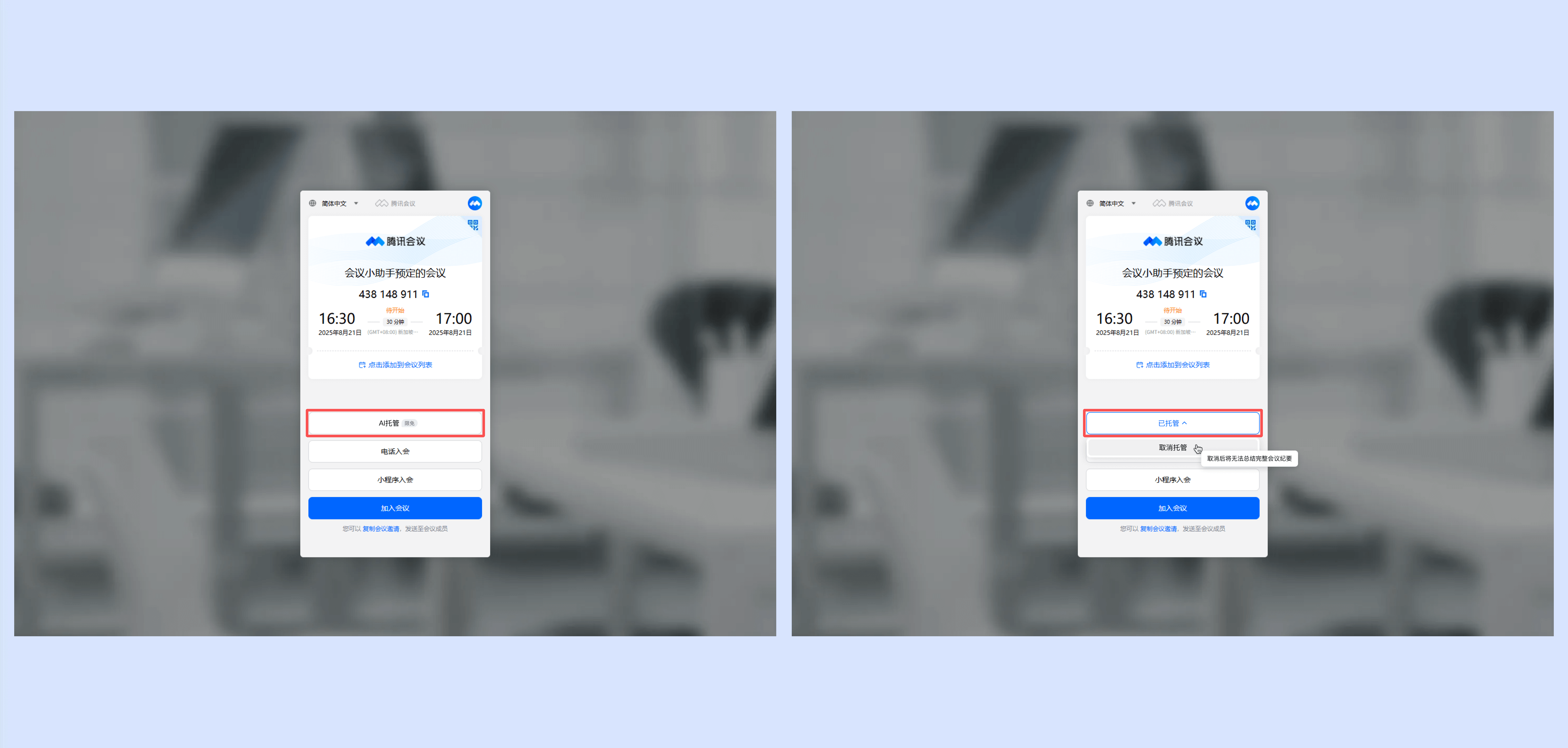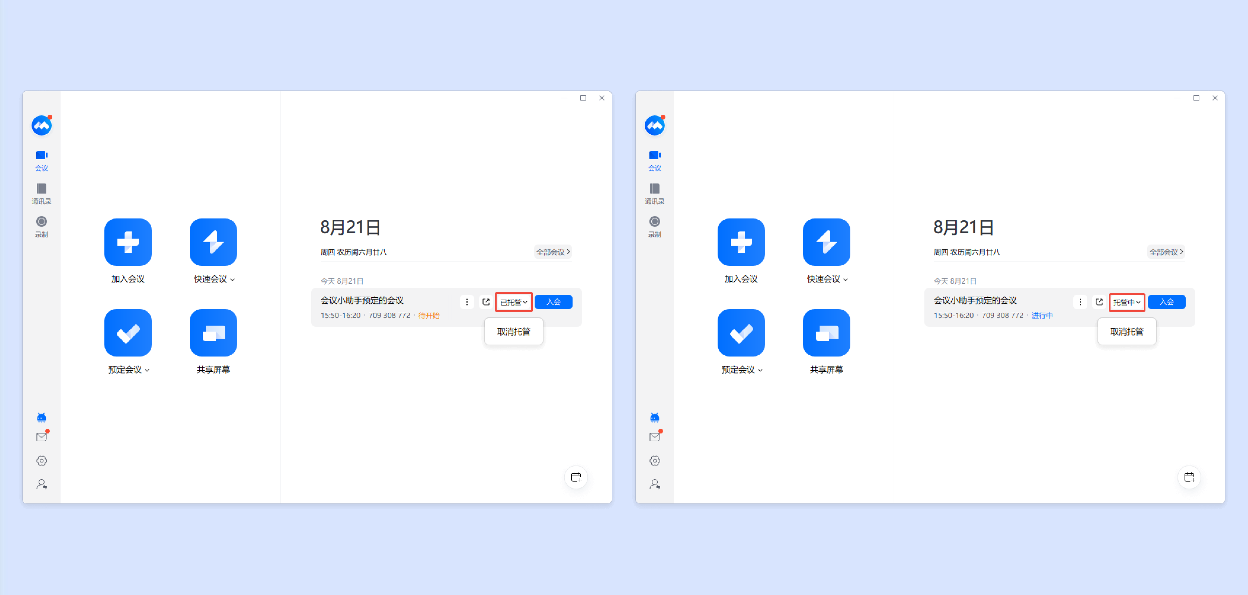 ②托管会议成功后您将自动离会,会议状态将变更为托管中,支持取消托管。