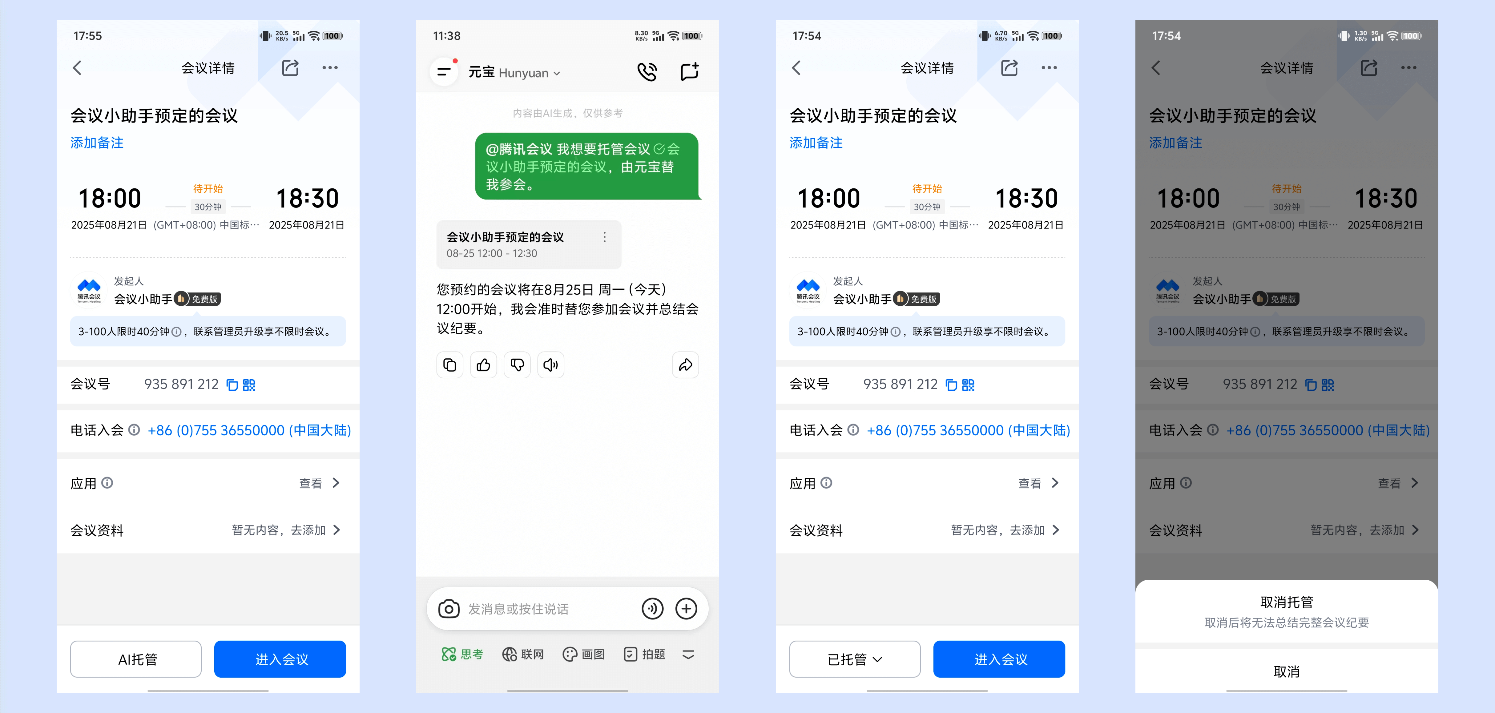 ①您可在主界面会议列表中,点击需要托管的会议,在其会议详情页面中点击【AI托管】,即可唤起腾讯元宝,在会议开始时自动托管入会,若会议正处在进行中,则直接发起托管入会。会议结束后可在腾讯元宝中查看会议纪要。