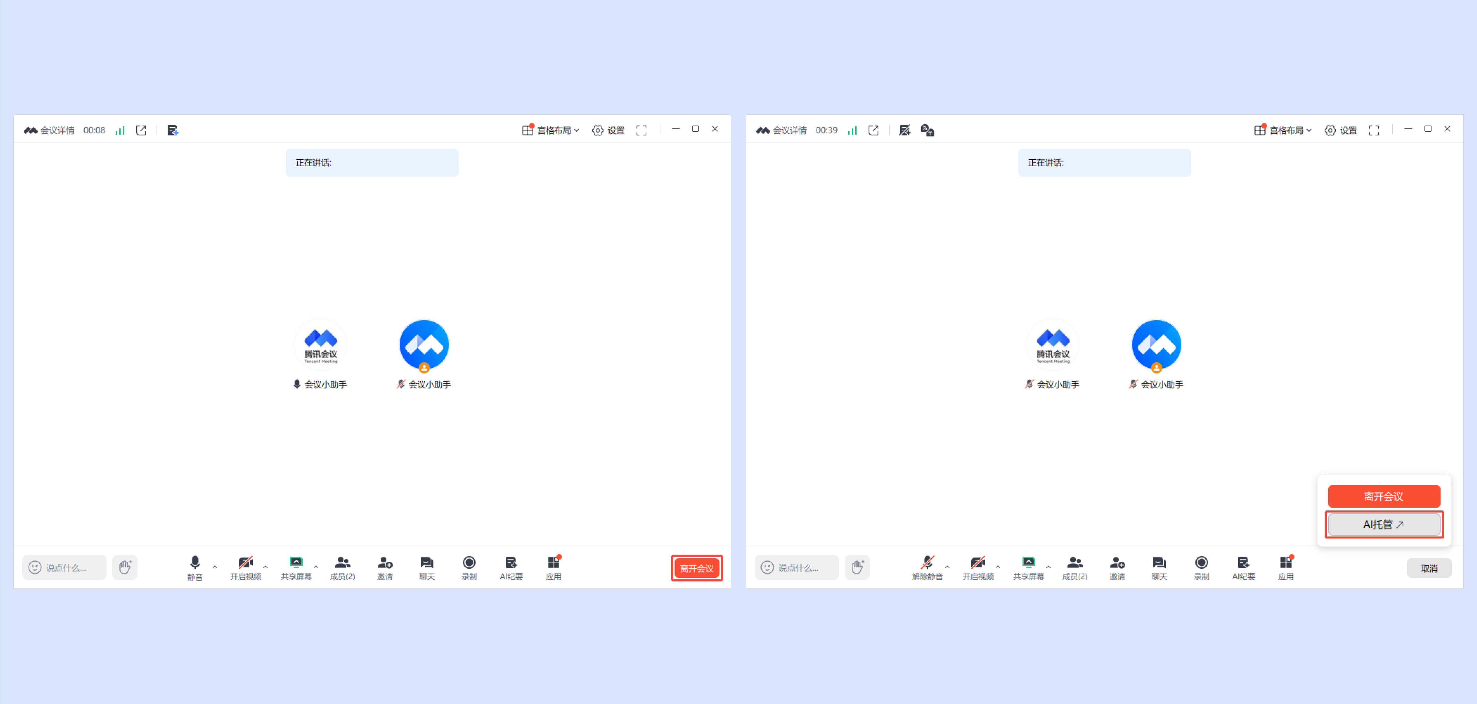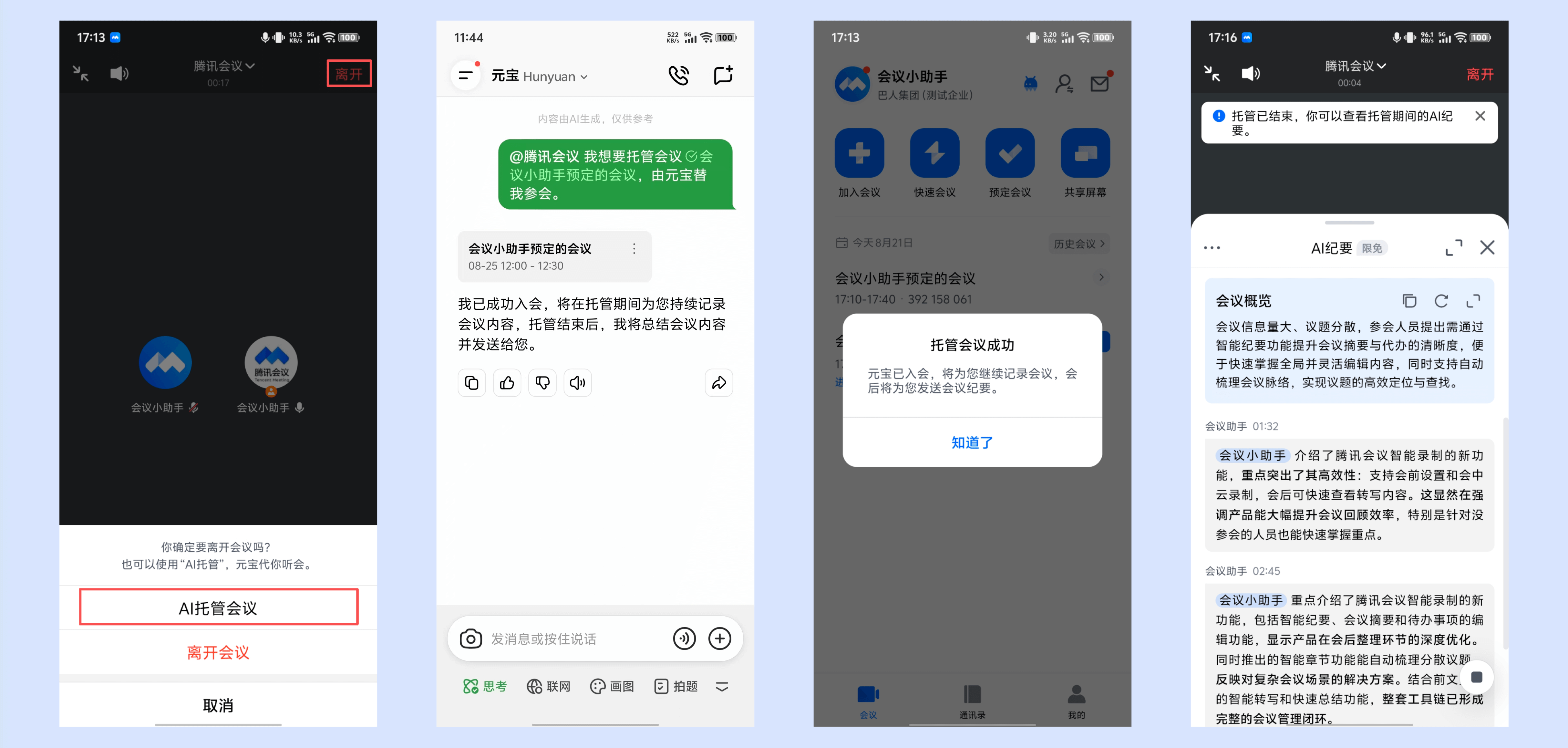 ①会议中,您可以点击【离开会议】,选择【AI托管】,即可唤起腾讯元宝为您托管会议,会后发送会议纪要。当您是会议主持人时,则需要先移交主持人后,再发起托管。