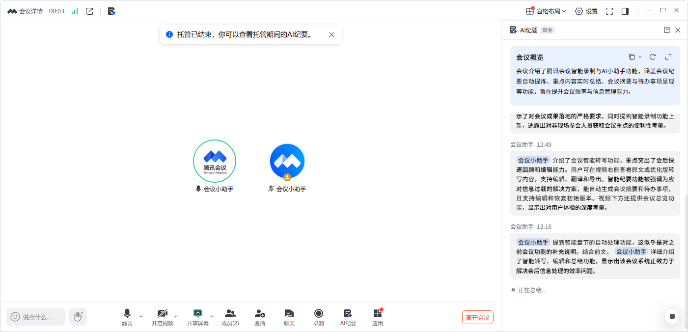 ③当您重新入会时,将自动取消托管,可在AI纪要中查看会议讨论内容。