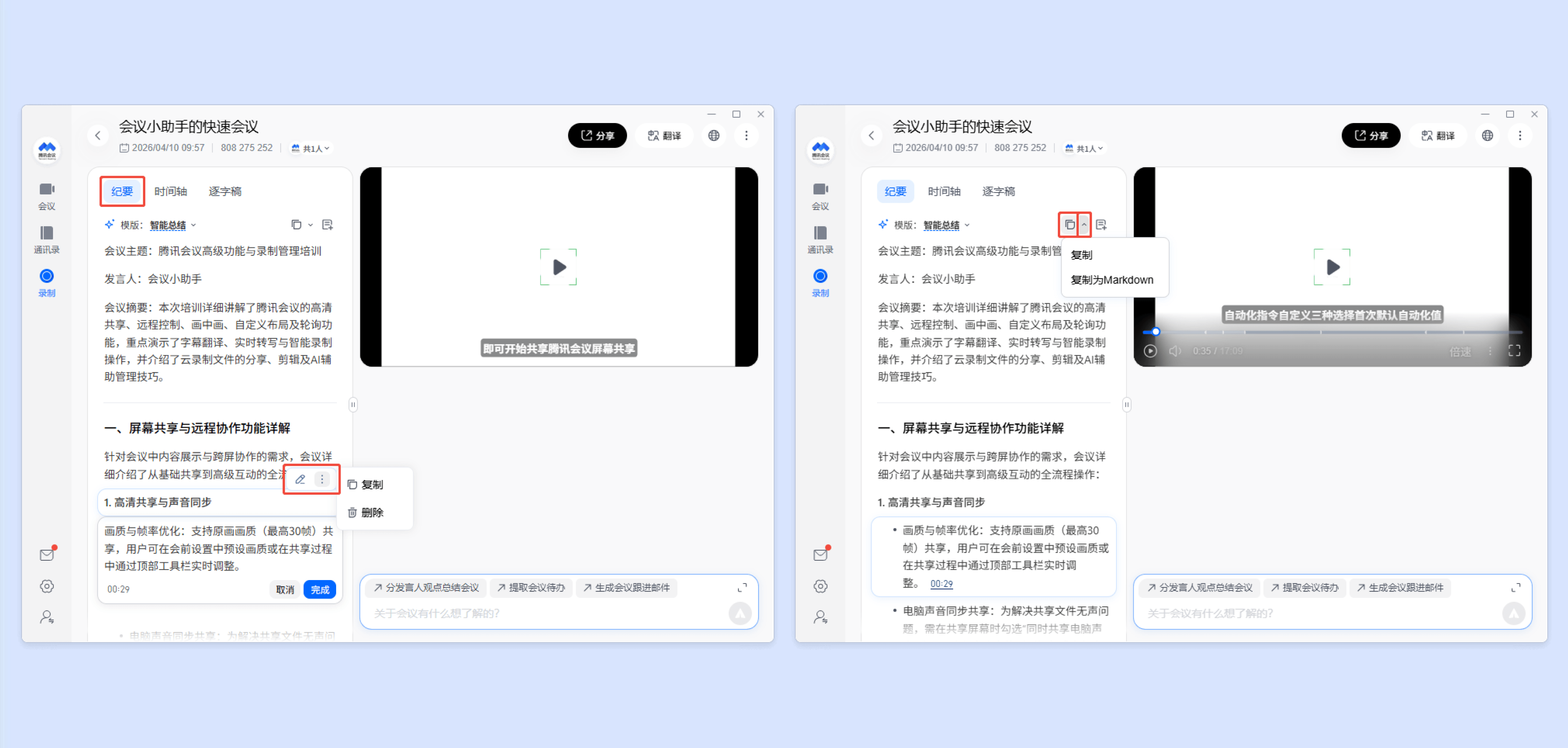 ③点击纪要内容右上角复制按钮,即可一键复制当前整篇文本内容,可选择复制或复制为Markdown。