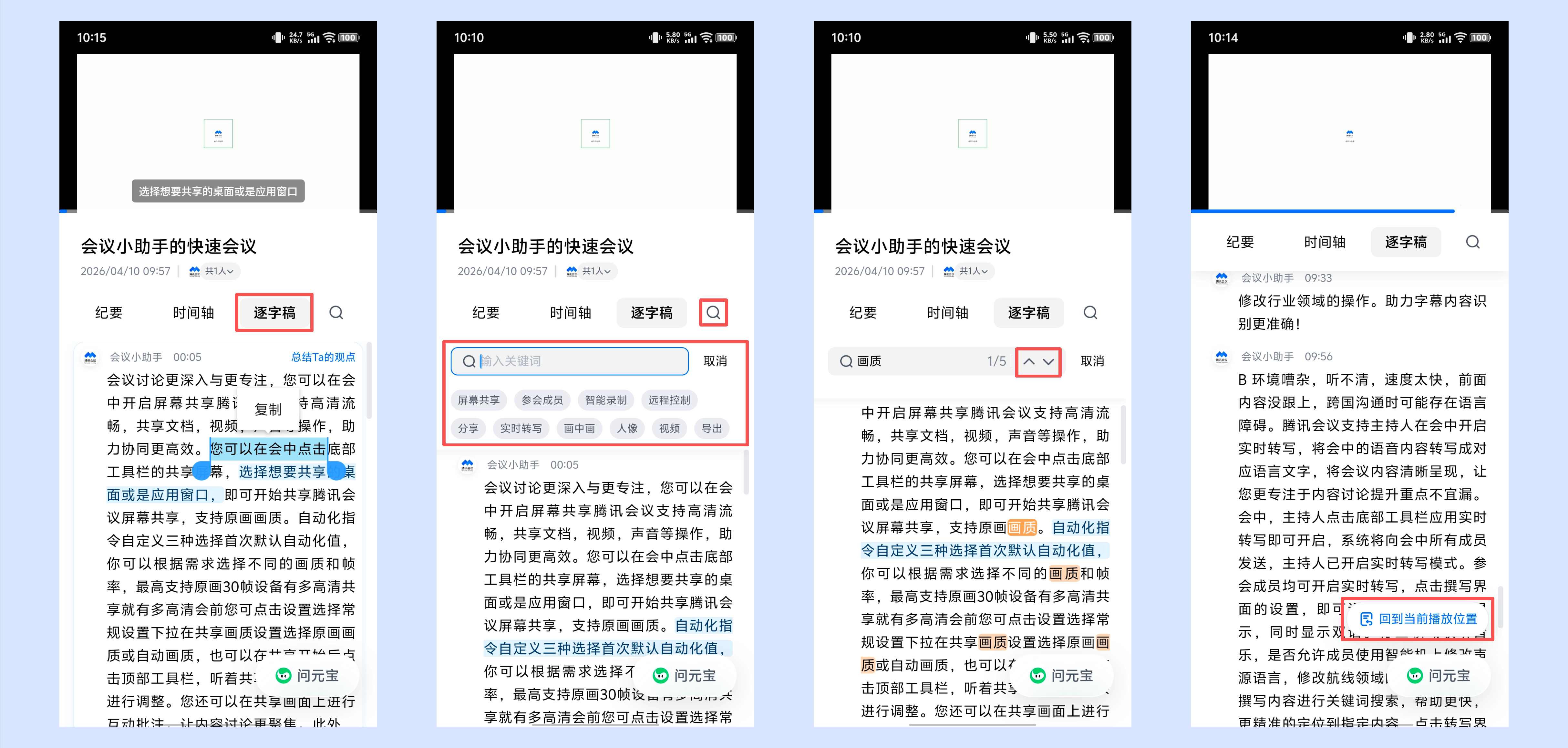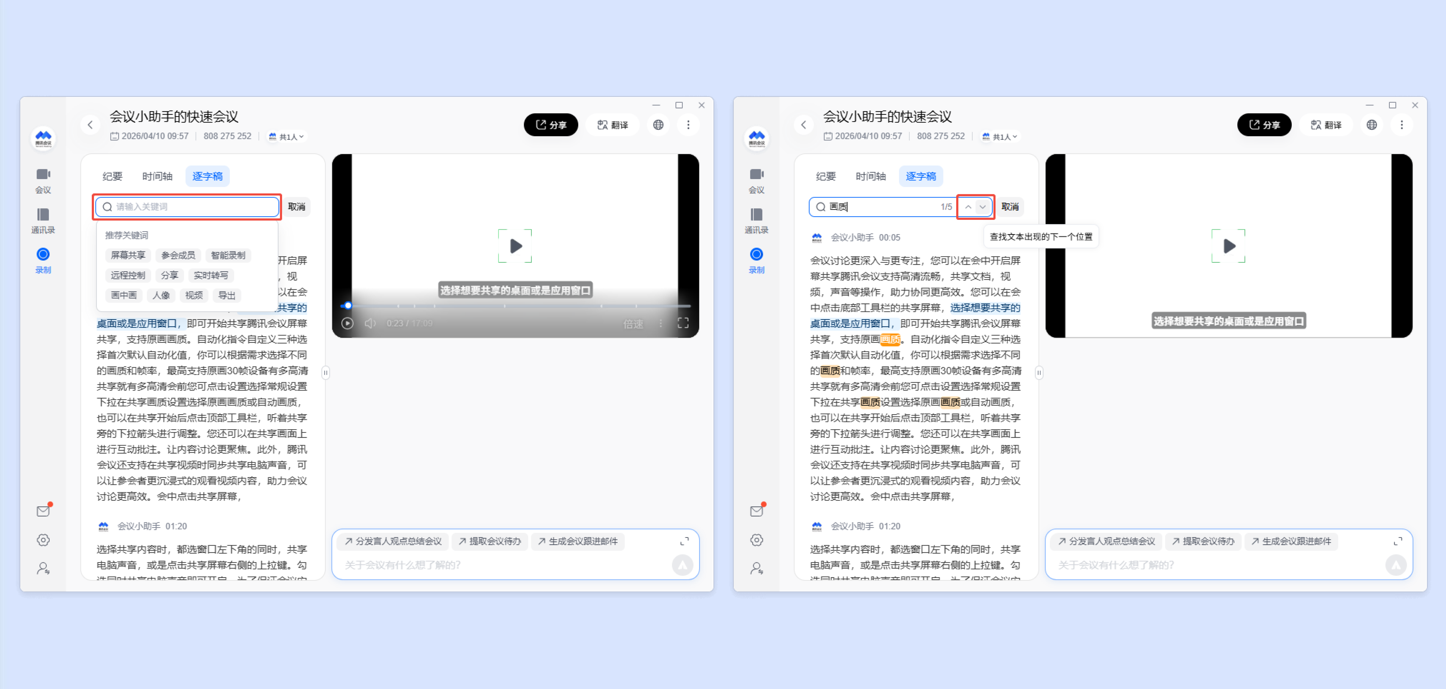 逐字稿:会议转写内容升级为逐字稿。更清晰的结构帮助您快速厘清发言内容,关键发言人观点可随时让AI总结,点击感兴趣的任何一句逐字稿,即刻定位到原文位置。
