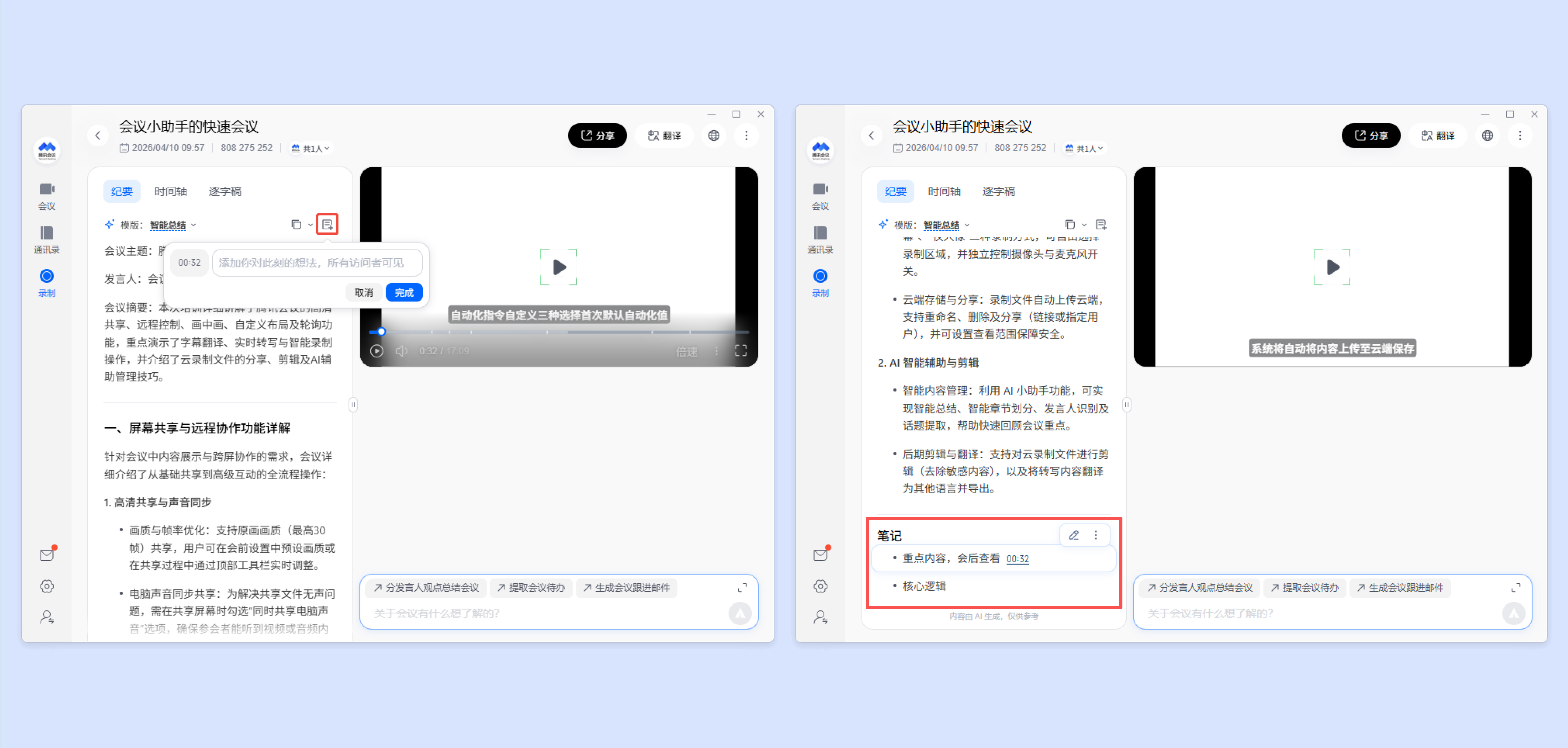 ④点击纪要内容右上角添加笔记按钮,即可对当前播放节点添加笔记备注。完成添加后将按照添加时间呈现在纪要内容底部「笔记」模块,并支持编辑、删除笔记内容。