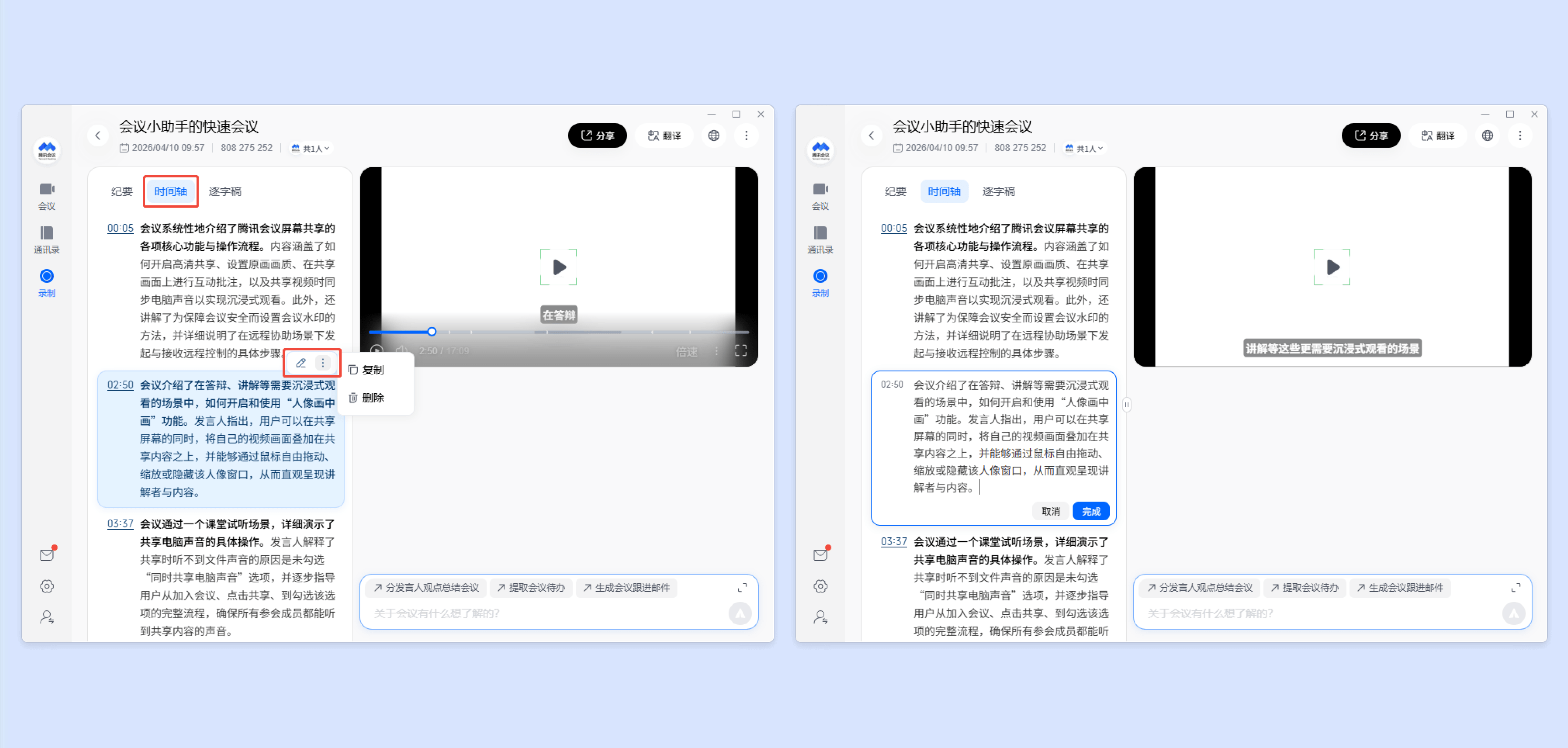 ②点击某段纪要内容,即可跳转索引对应原文自动播放,并支持对该段内容进行编辑、复制、删除操作。