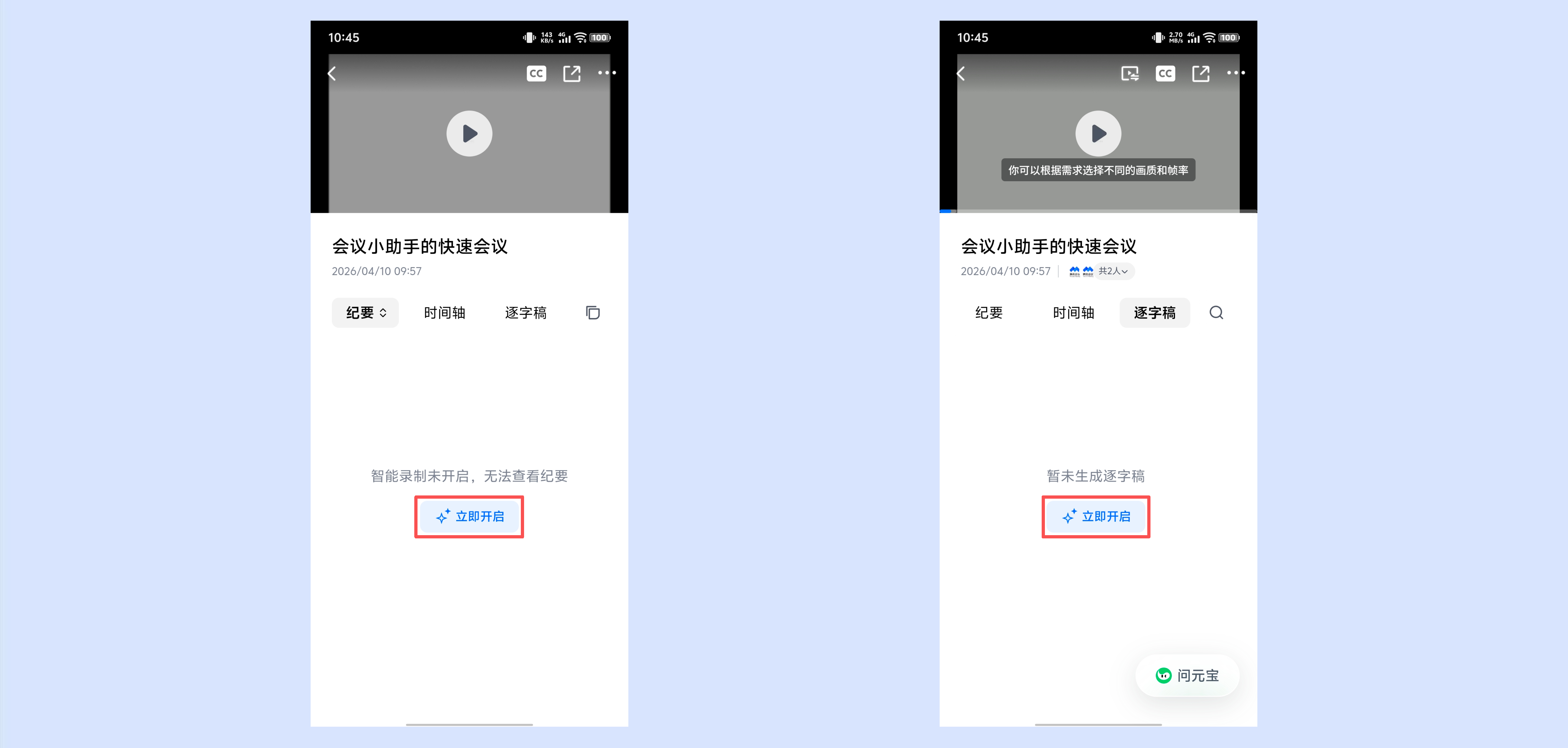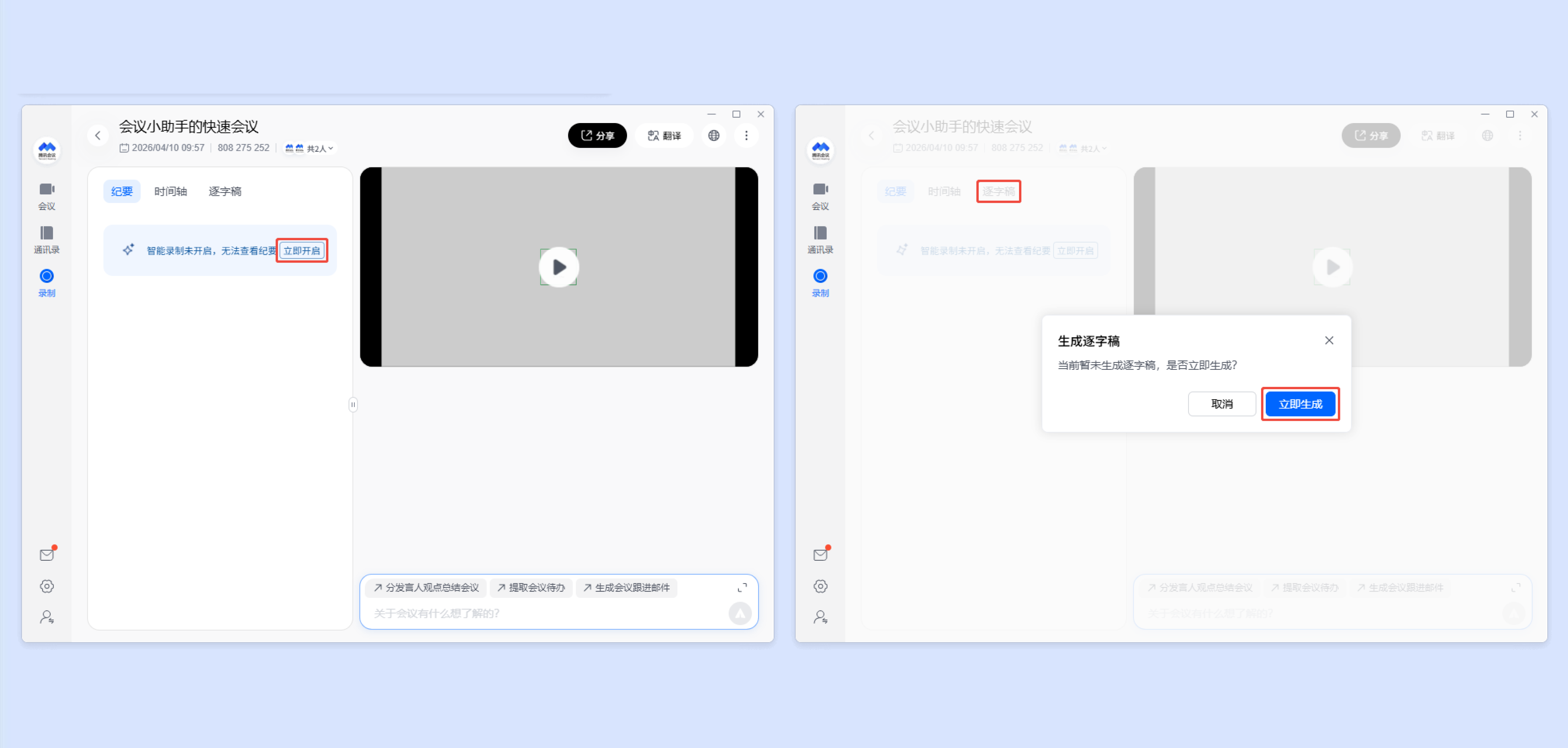 ②若创建者在会议开始前未开启智能录制,会后可在录制详情页面点击【立即开启】、【立即生成】。