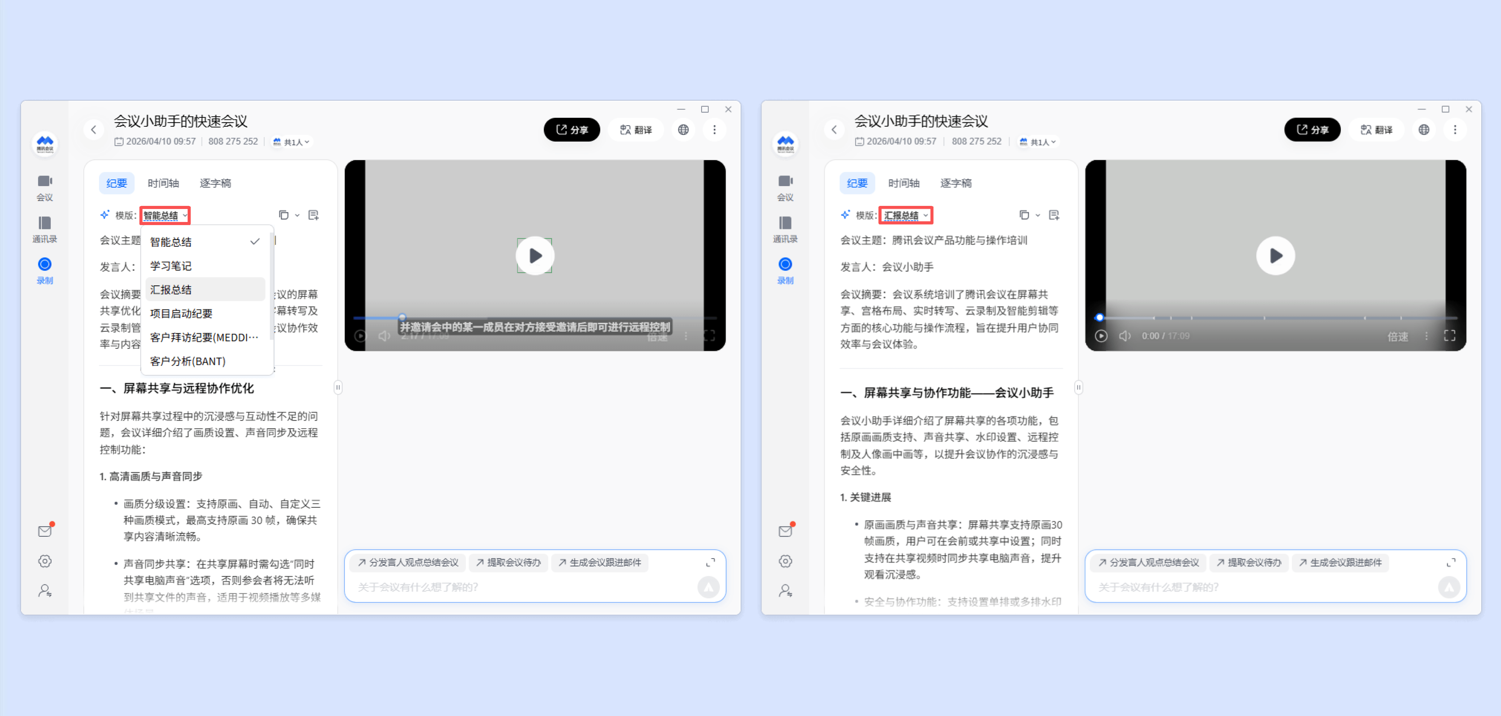 ⑤点击纪要内容左上角「模板」,即可根据需要切换纪要模板,切换后即可生成相应的纪要内容。