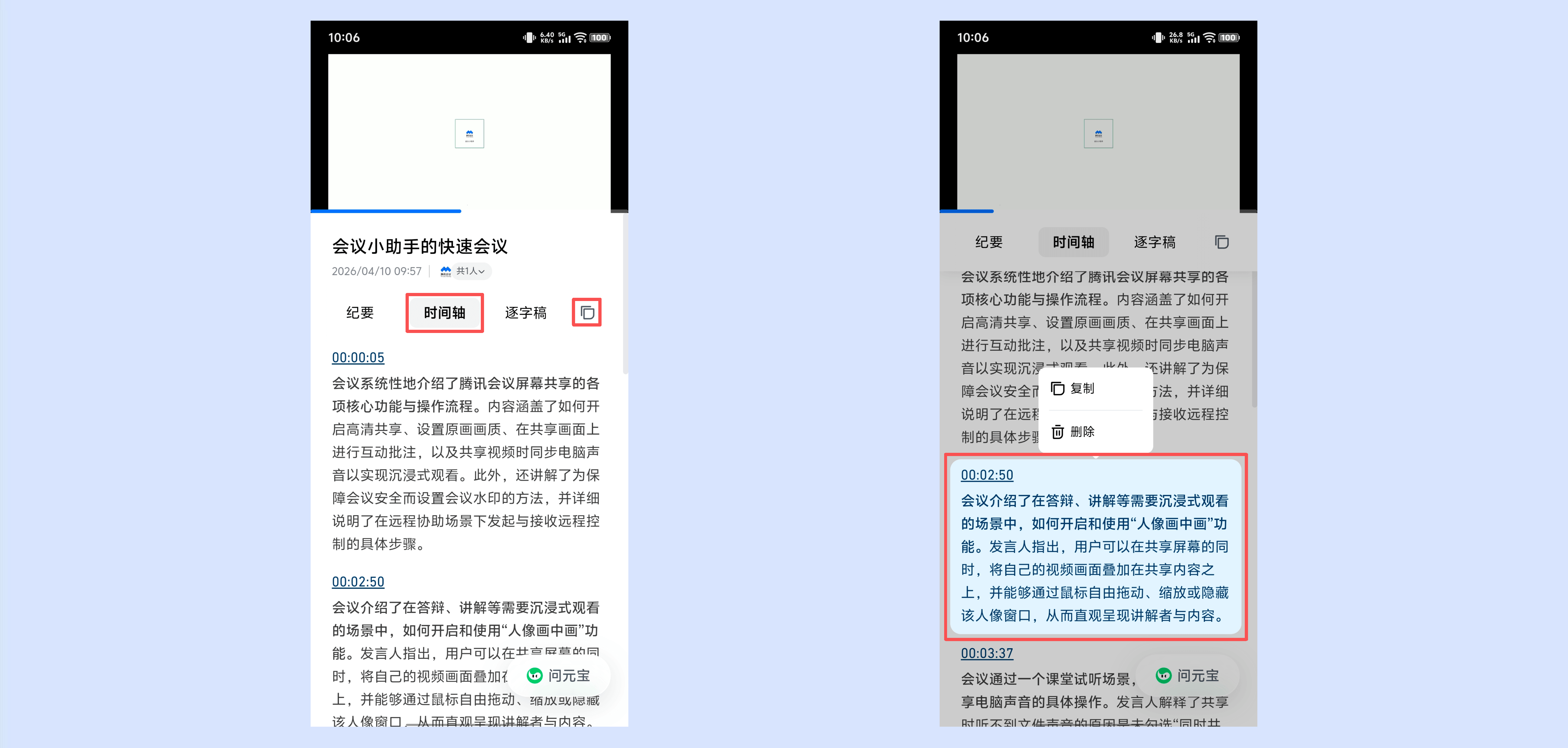 ②点击纪要内容,即可跳转索引信息自动播放,长按可对该段内容进行复制、删除操作。