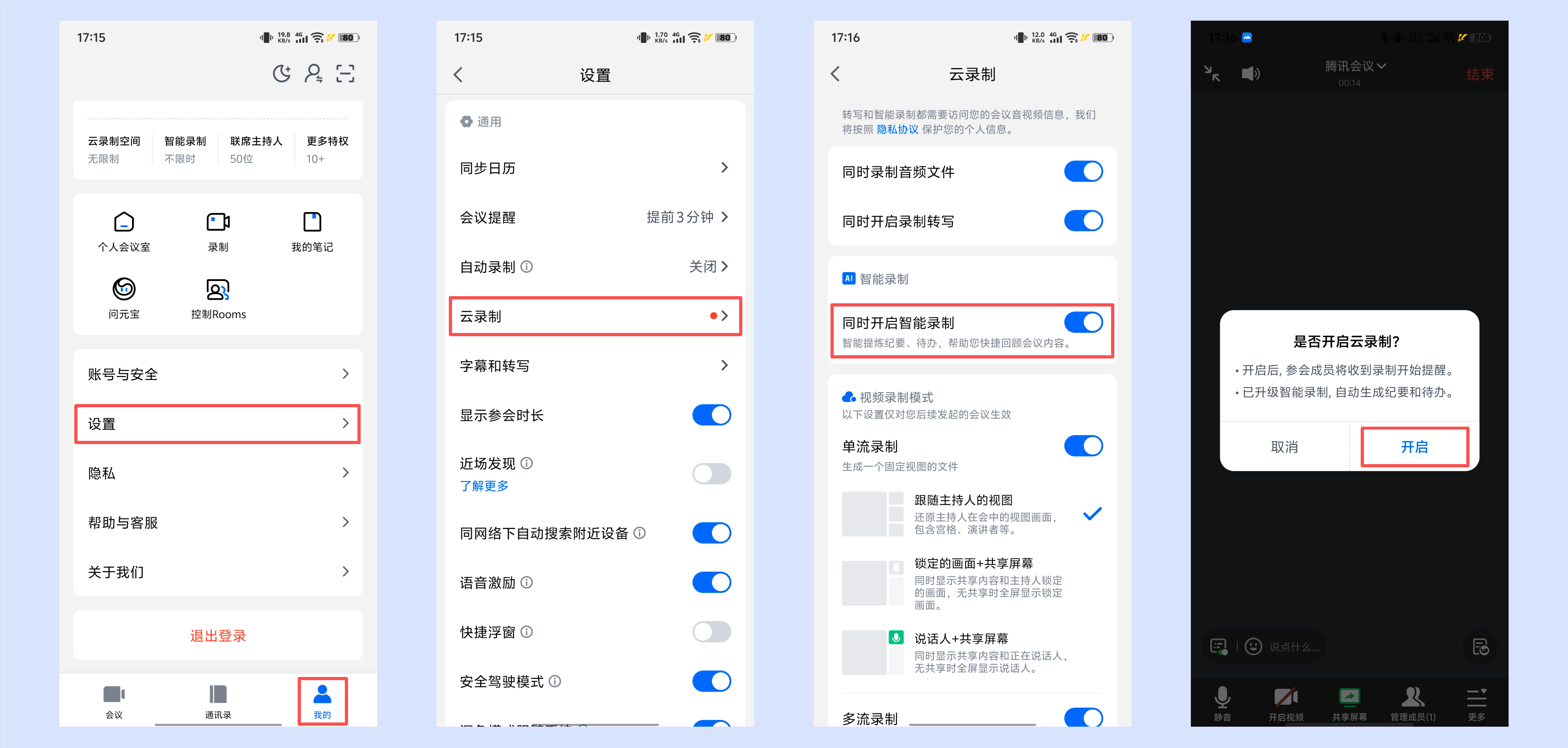 ①会议开始前,您可以在APP主界面点击右下角【我的】->【设置】->【云录制】->开启【同时开启智能录制】后,即可在会中开启云录制时进行智能录制,智能提炼纪要、待办,帮助您快捷回顾会议内容。