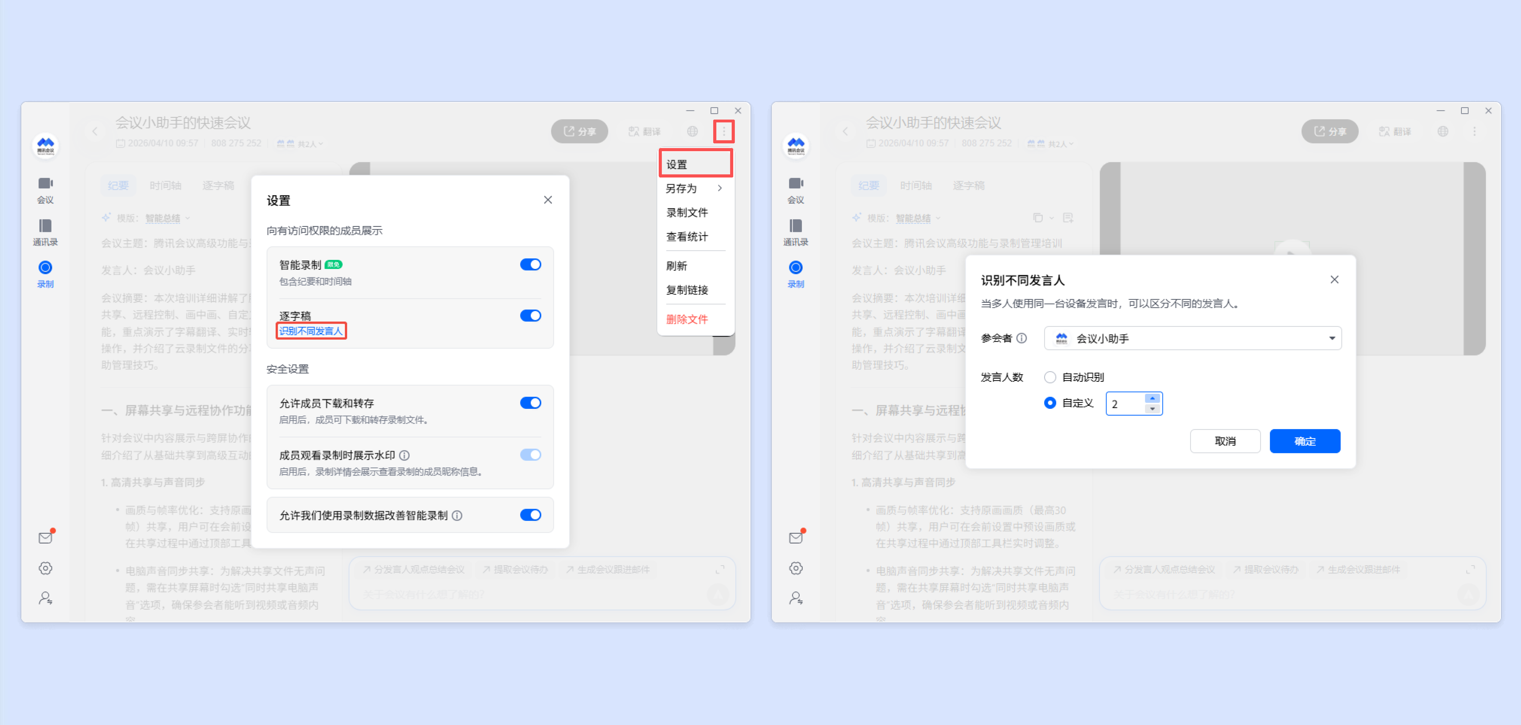④当会中存在多人使用同一台设备发言,未曾在文本中显示出来时,可点击右上角“更多”按钮->【设置】->【识别不同发言人】,选择需要被识别的参会者,选择自动识别/自定义发言人数后,点击【确定】,即可重新生成文本内容。