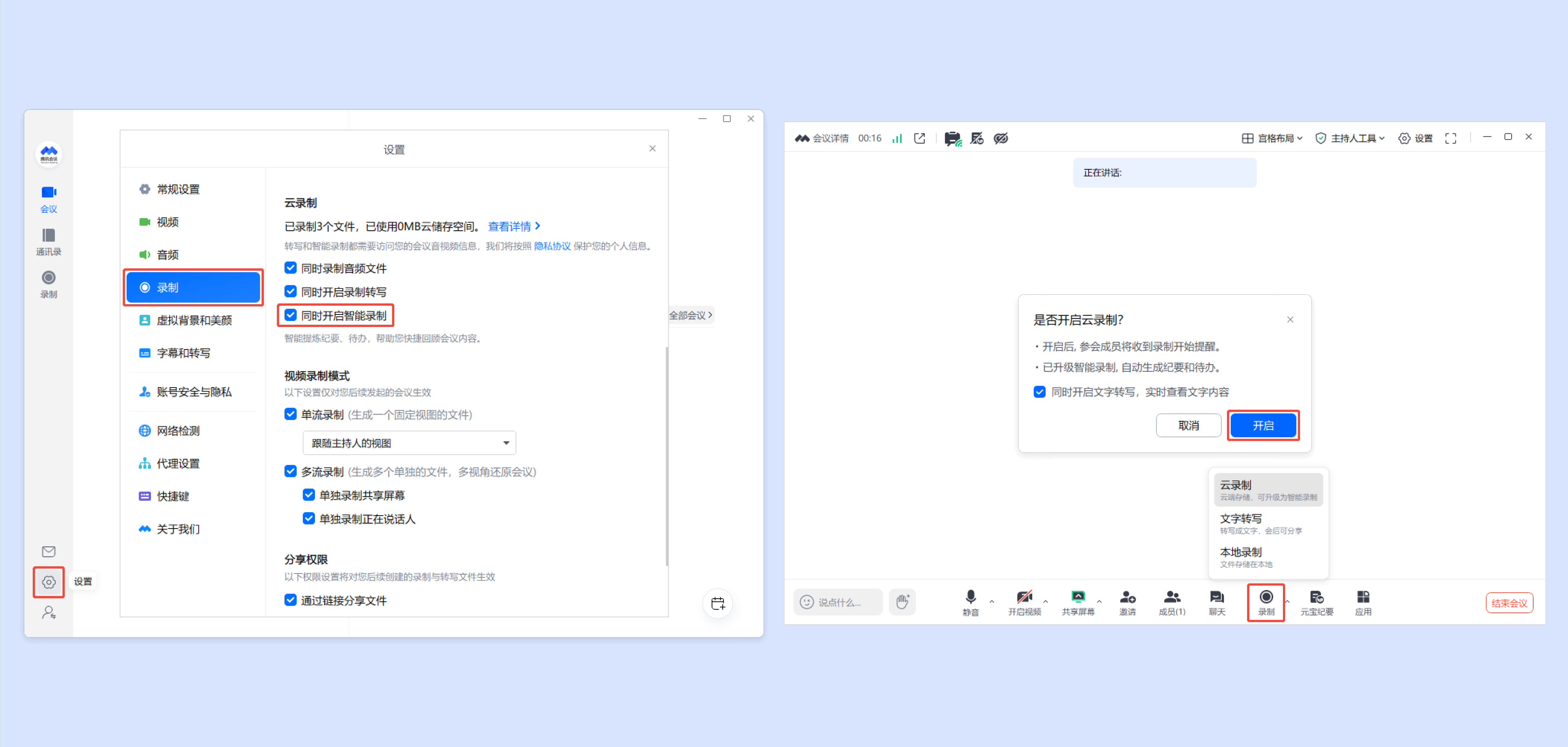 ①会议开始前,您可以在客户端主界面点击左下角【设置】->【录制】->勾选开启【同时开启智能录制】后,即可在会中开启云录制时进行智能录制,智能提炼纪要、待办,帮助您快捷回顾会议内容。