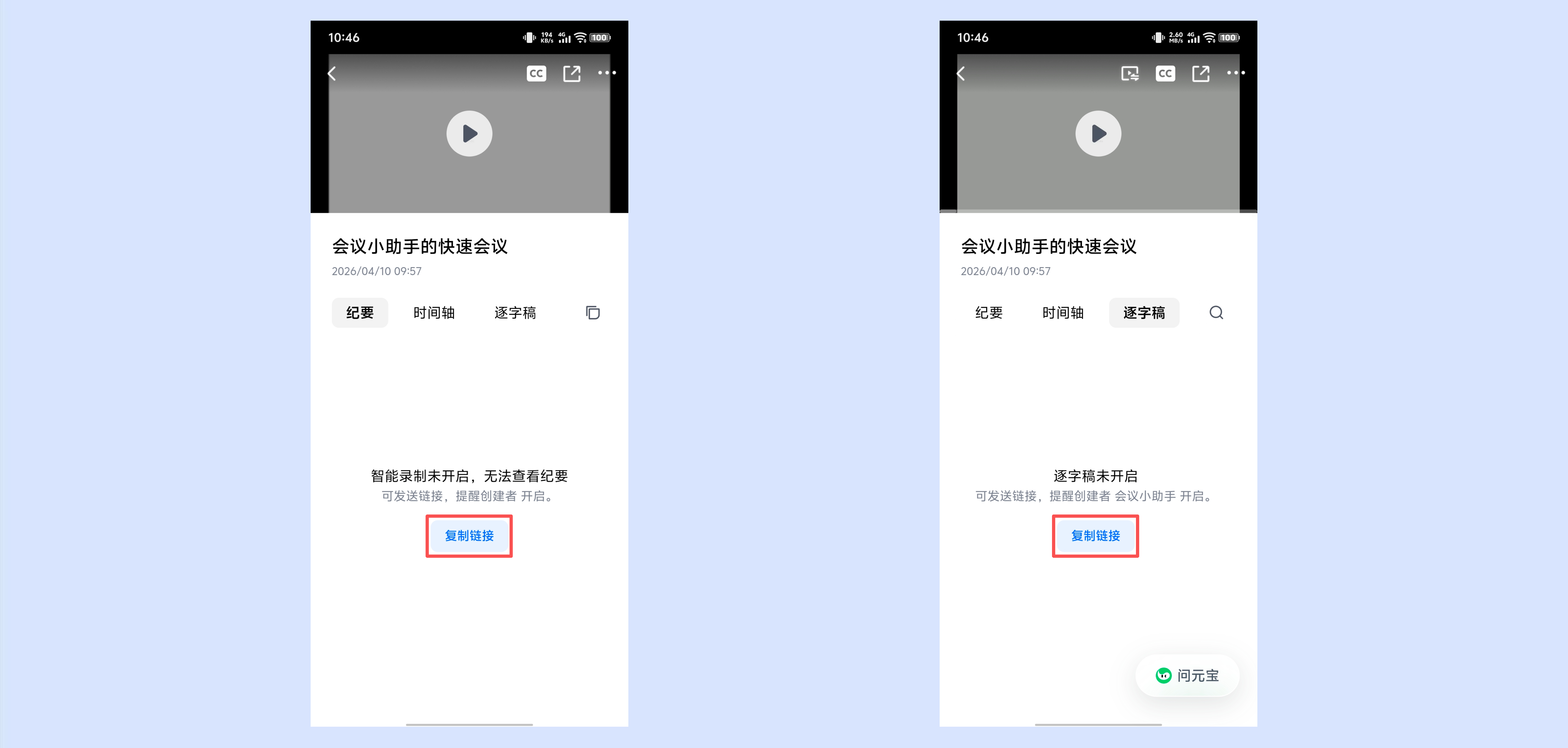 ③当访问者在访问云录制文件时,提示未开启智能录制/未生成逐字稿时,可复制链接发送给会议创建者,设置开启。
