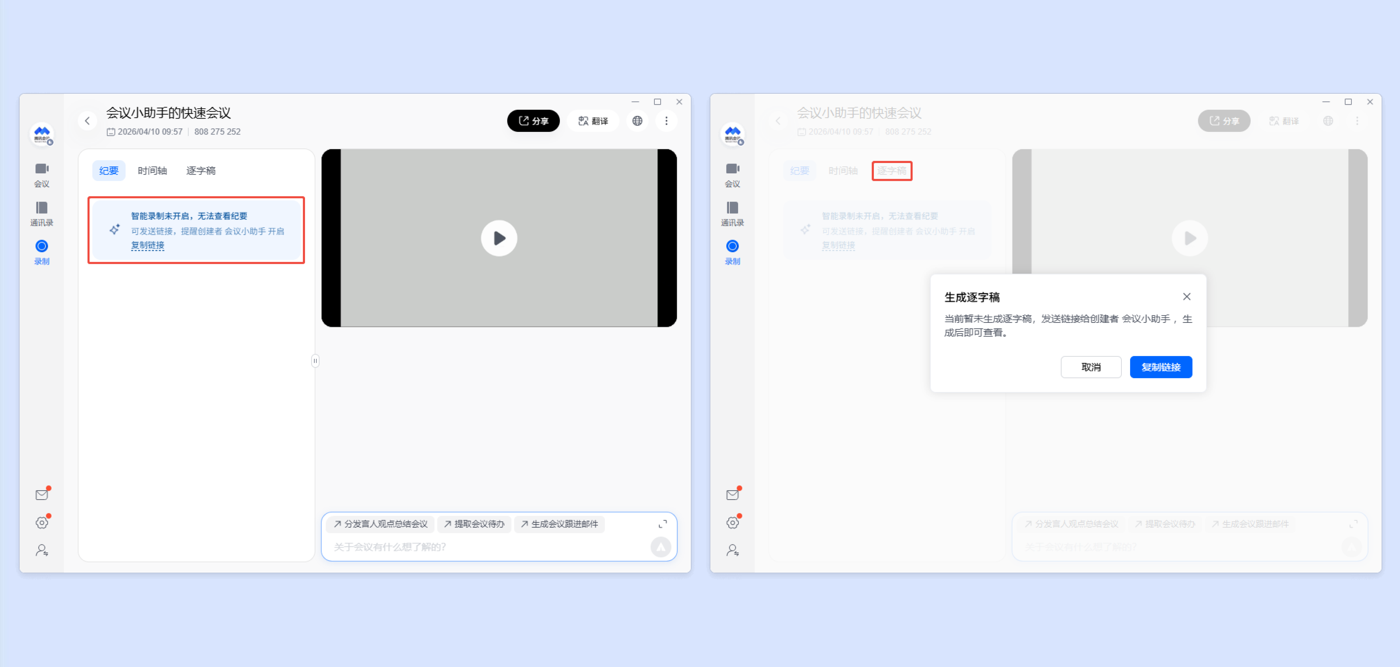 新版智能录制对智能纪要、时间轴、逐字稿等功能进行了升级,辅助您更高效地使用会议资产。