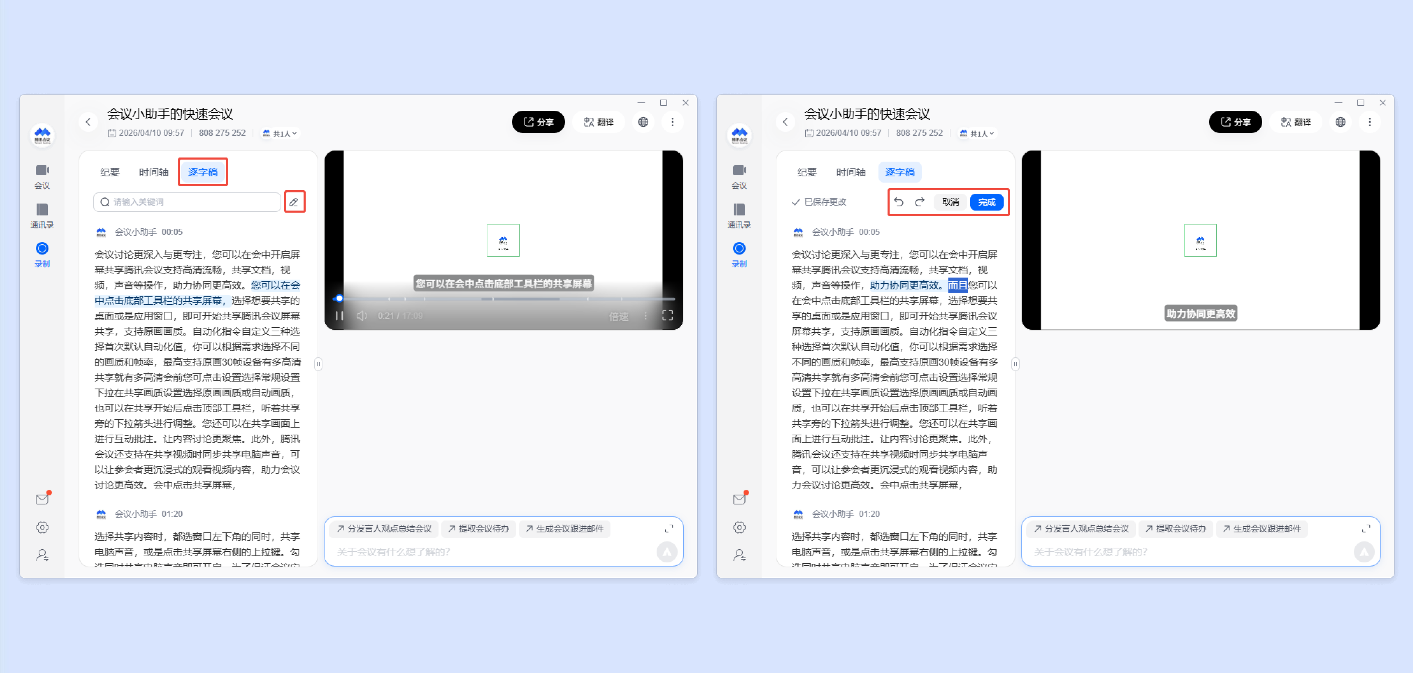 ②点击逐字稿内容左上角编辑按钮,即可对逐字稿内容进行修改,在修改过程中将实时保存更改内容并支持撤回。