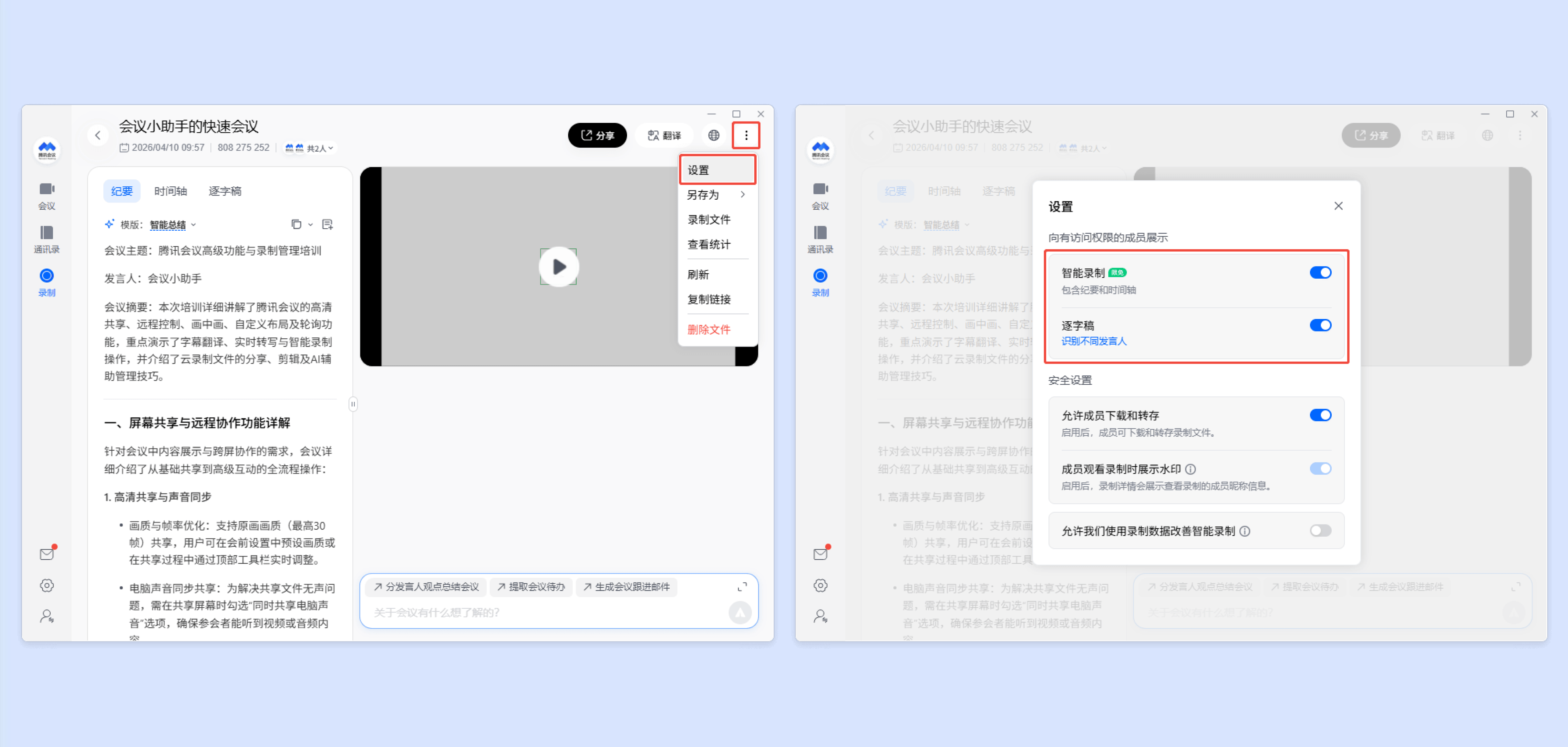 ④会议创建者开还可以点击右上角“···”按钮,管控智能录制、逐字稿开启权限。